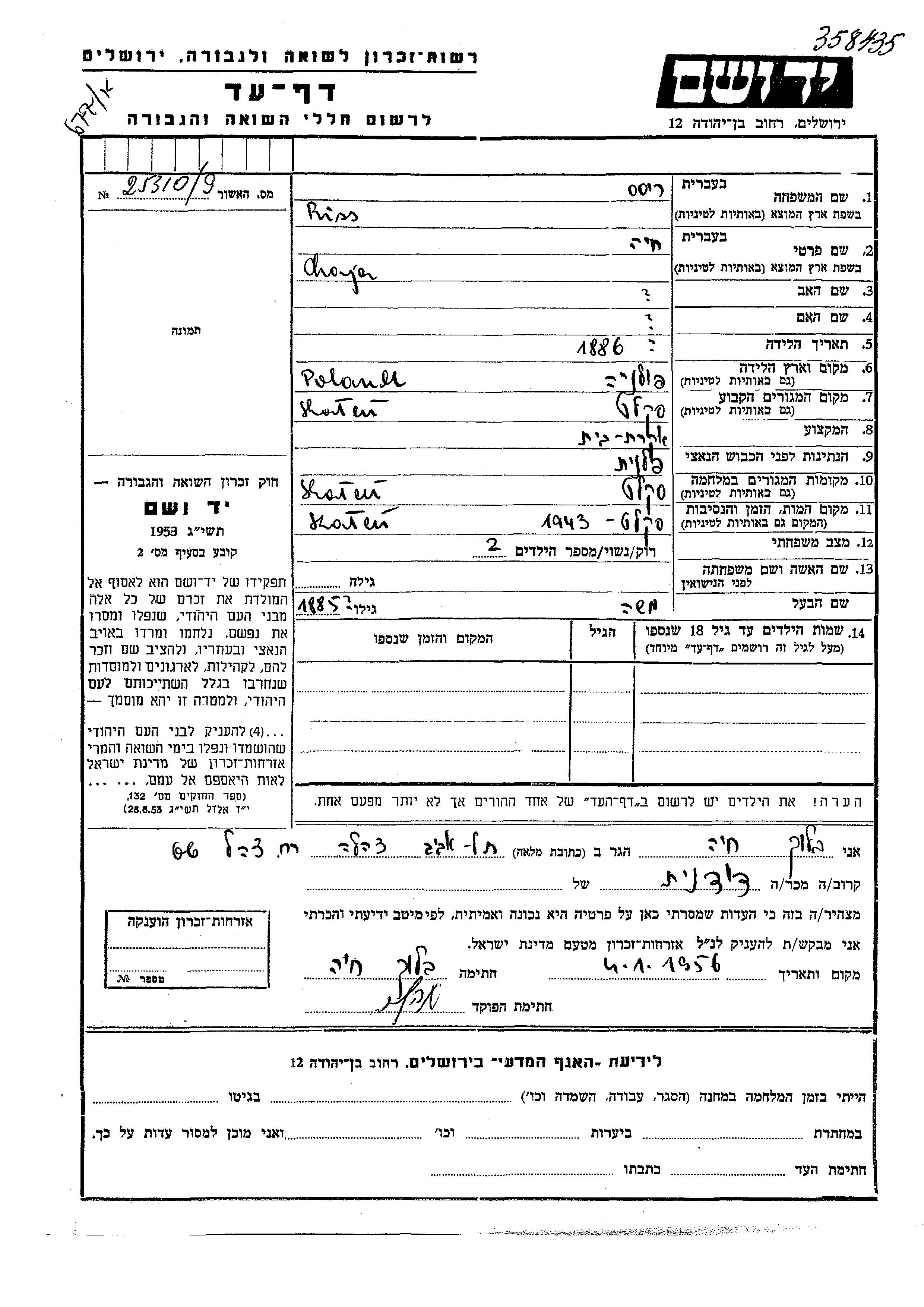 Chaja Riss wurde im Jahr 1886 in Polen geboren. Sie war Hausfrau und mit Moshe Verheiratet. Vor dem Zweiten Weltkrieg lebte sie in Skalat, Polen. Während des Krieges war sie in Skalat, Polen.