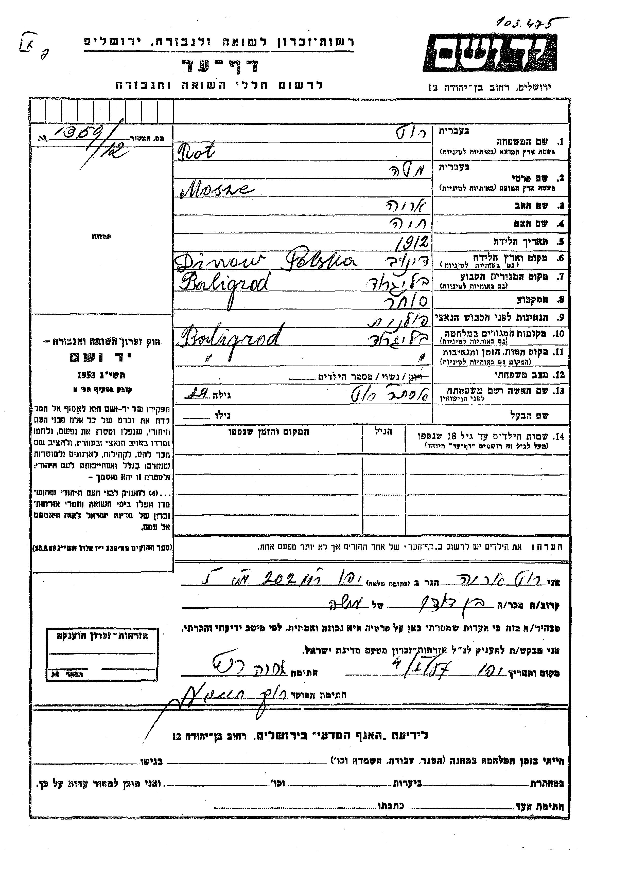 Mosze Rot Rut wurde im Jahr 1912 in Dinow, Polen geboren. Er war der Sohn von Arie und Khaia. Er war Kaufmann/-frau und mit Ester Verheiratet. Vor dem Zweiten Weltkrieg lebte er in Baligrod, Polen. Während des Krieges war er in Baligrod, Polen.
