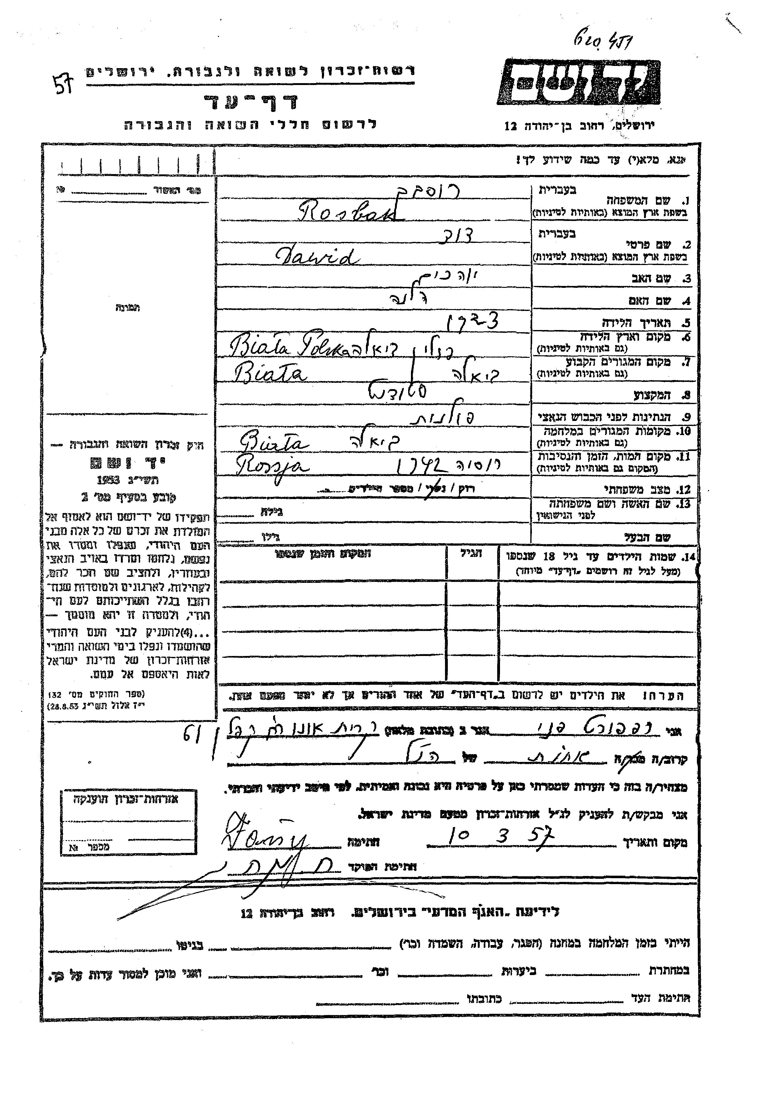Dawid Rosbak wurde im Jahr 1923 in Biala Podlaska, Polen geboren. Er war der Sohn von Ioakhim und Helena. Er war Student und Ledig. Vor dem Zweiten Weltkrieg lebte er in Biala Podlaska, Polen. Während des Krieges war er in Biala Podlaska, Polen.