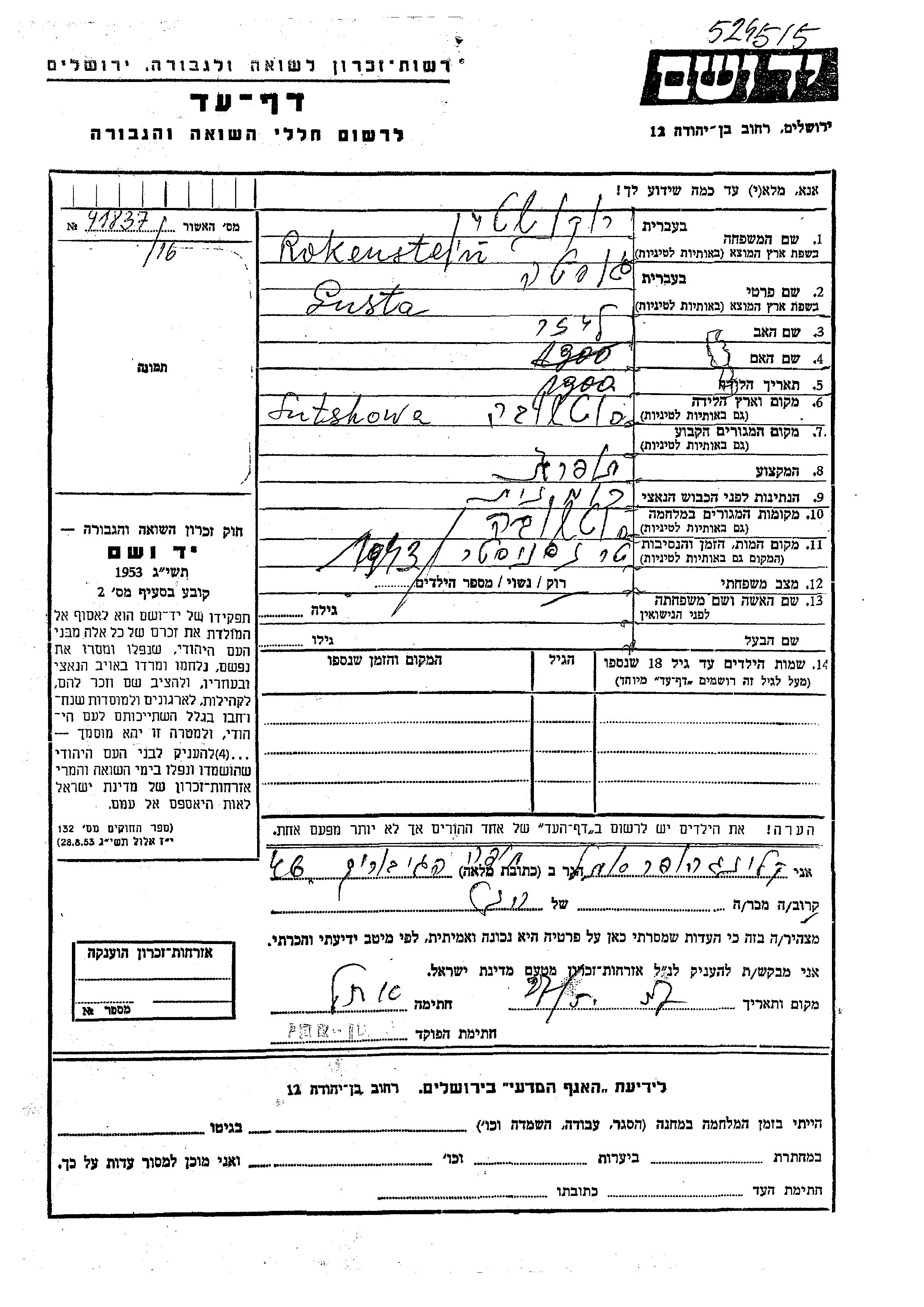 Gusta Rokenstein wurde im Jahr 1900 in Sutchava, Rumänien geboren. Sie war die Tochter von Leizer. Sie war Schneiderin und Ledig. Während des Krieges war sie in Sutchava, Rumänien.
