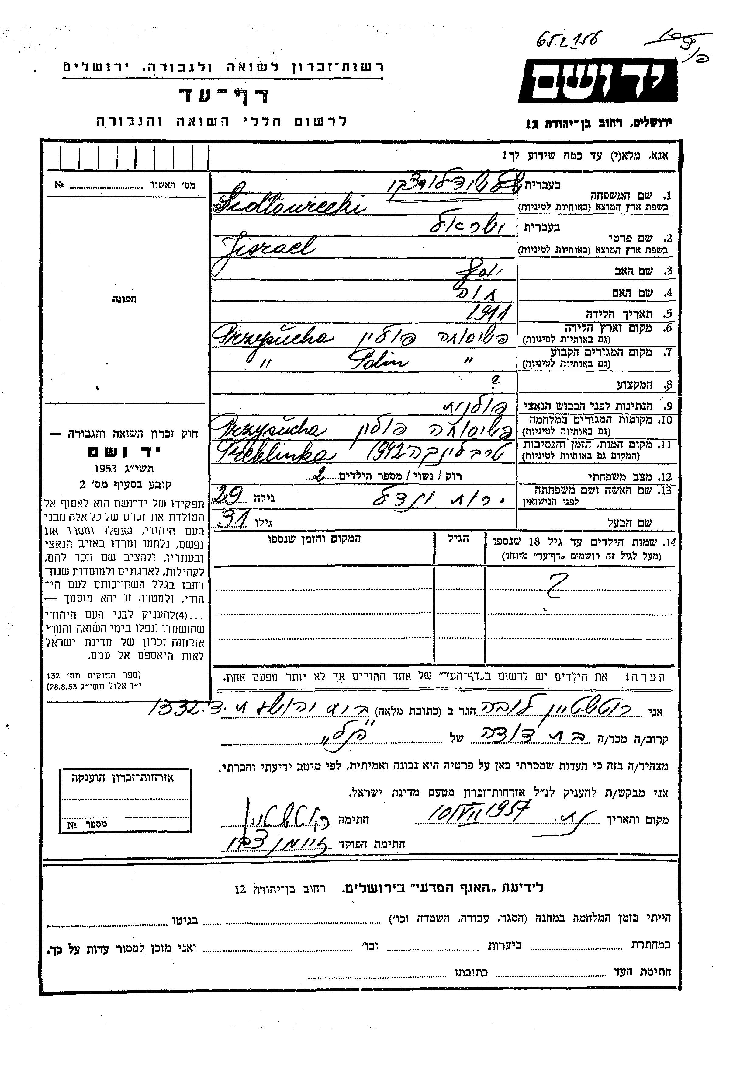 Jisrael Sidlowiecki wurde im Jahr 1911 in Przysucha, Polen geboren. Er war der Sohn von Yosef und Khava. Er war mit Rut, geb. Vandel Verheiratet. Vor dem Zweiten Weltkrieg lebte er in Przysucha, Polen. Während des Krieges war er in Przysucha, Polen.