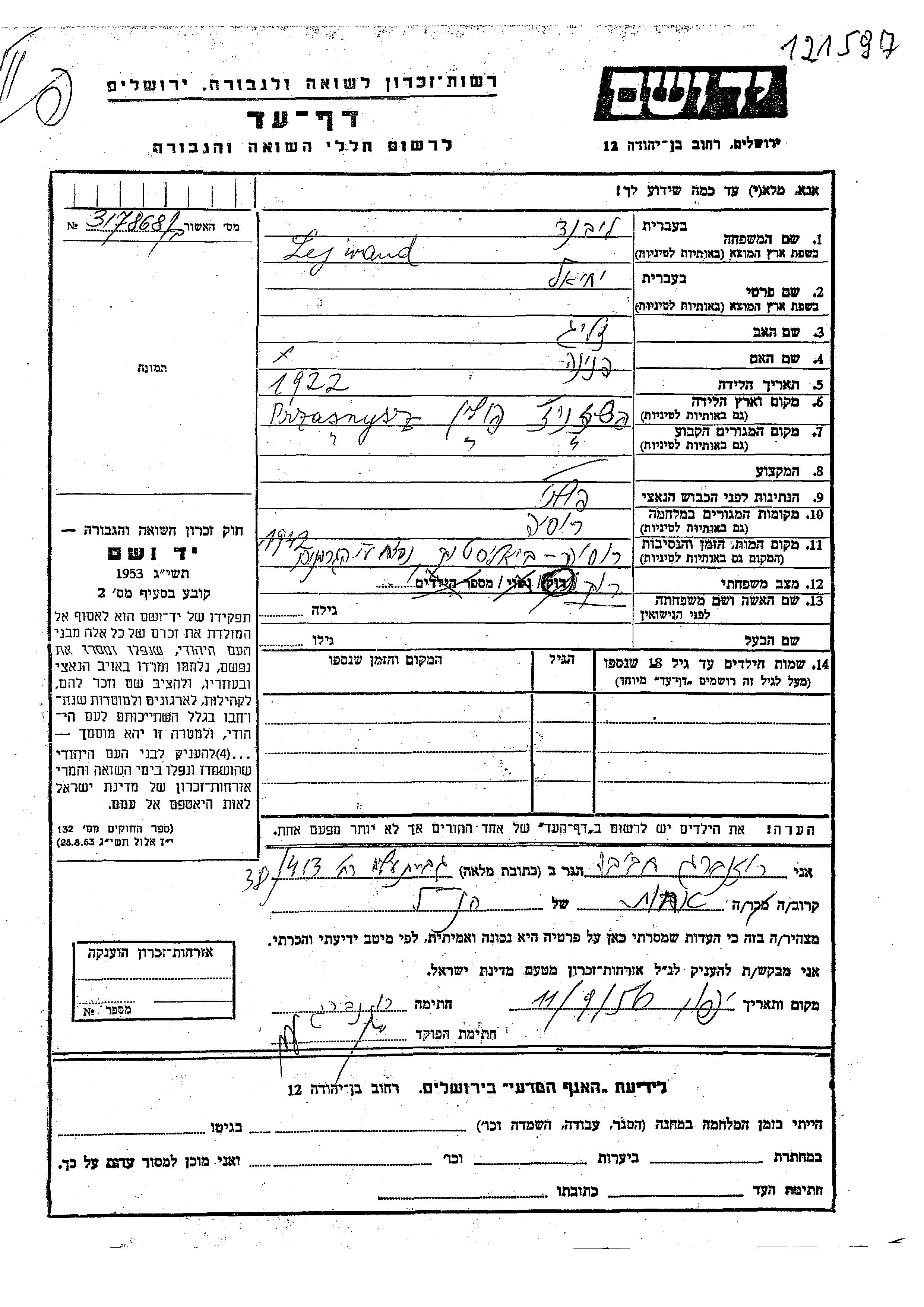 Yekhiel Lejwand Laband wurde im Jahr 1922 in Przasnysz, Polen geboren. Er war der Sohn von Zelig und Pnina. Er war Ledig. Vor dem Zweiten Weltkrieg lebte er in Przasnysz, Polen. Während des Krieges war er in Russland (UdSSR).