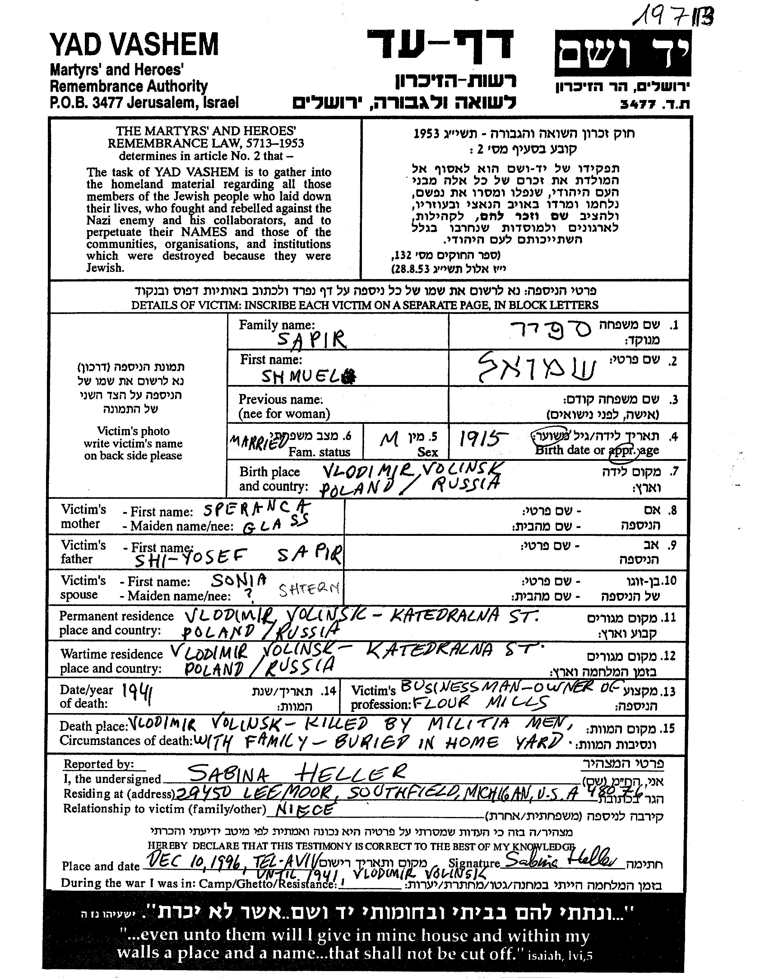 Szmuel Szafir wurde im Jahr 1920 in Wlodzimierz Wolynski, Polen geboren. Er war der Sohn von Yosef Yehoshua und Shprintza. Er war Kaufmann/-frau und mit Sonia, geb. Shtern Verheiratet. Vor dem Zweiten Weltkrieg lebte er in Wlodzimierz Wolynski, Polen. Während des Krieges war er in Wlodzimierz Wolynski, Polen.