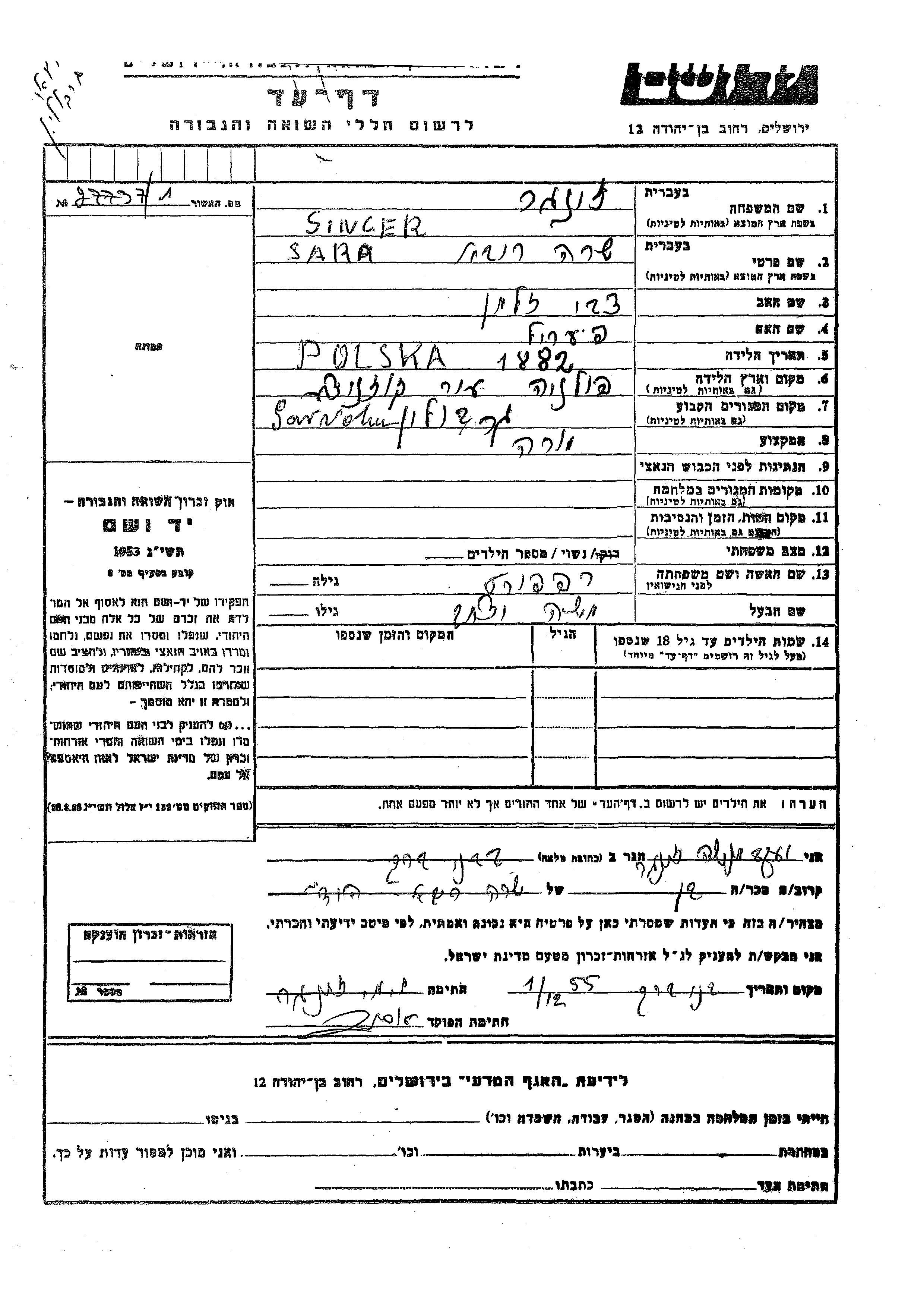 Sara Rivka Singer, geb. Rapaport wurde im Jahr 1882 in Kuznica, Polen geboren. Sie war die Tochter von Tzvi Zalman und Peril. Sie war Lehrer/in und mit Moshe Yitzkhak Verheiratet. Vor dem Zweiten Weltkrieg lebte sie in Garwolin, Polen.
