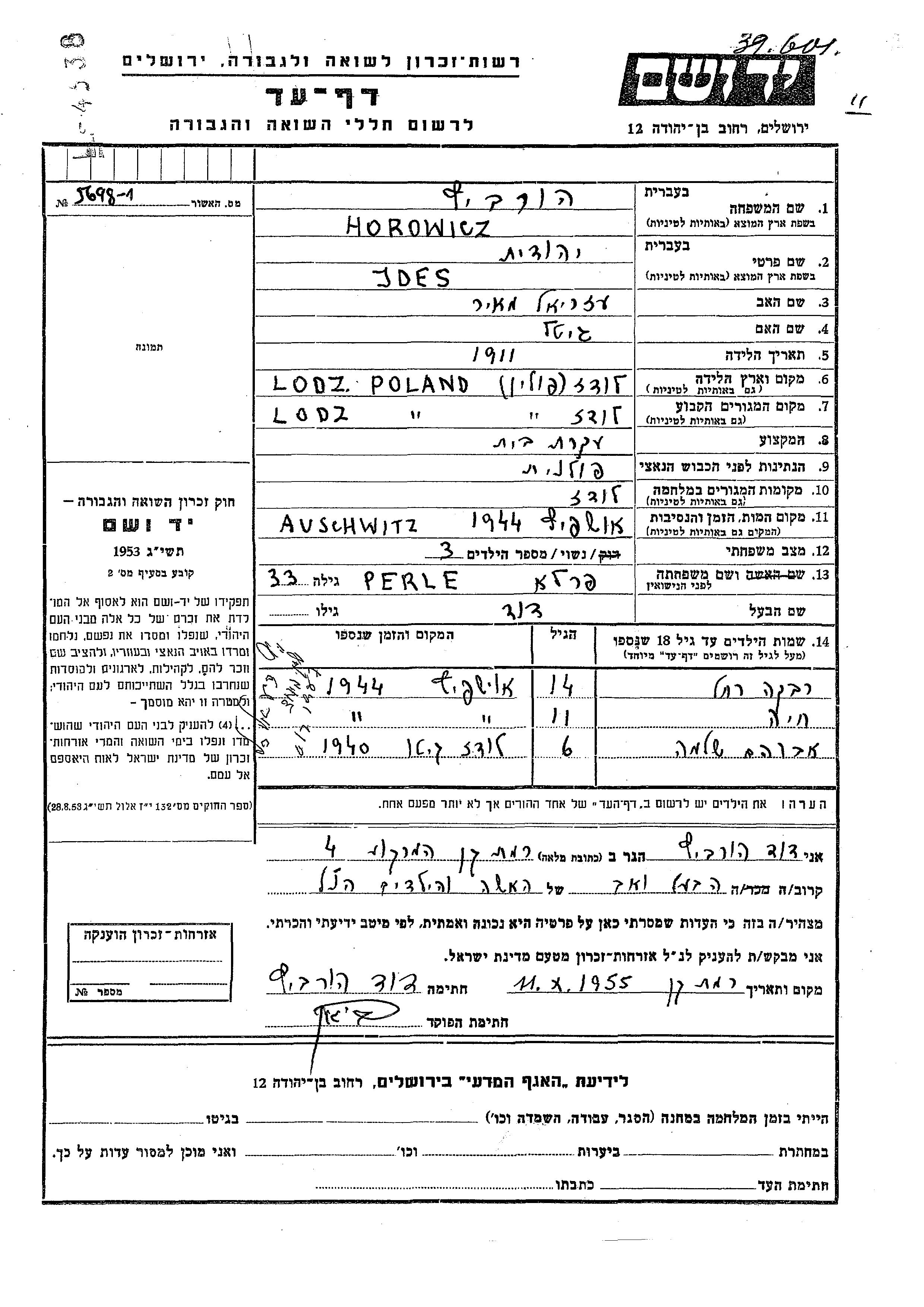 Ides Horowicz Hurvitz, geb. Perla wurde im Jahr 1911 in Lodz, Polen geboren. Sie war die Tochter von Azriel Meir und Gitel. Sie war Hausfrau und mit David Verheiratet. Vor dem Zweiten Weltkrieg lebte sie in Lodz, Polen. Während des Krieges war sie in Lodz, Polen.