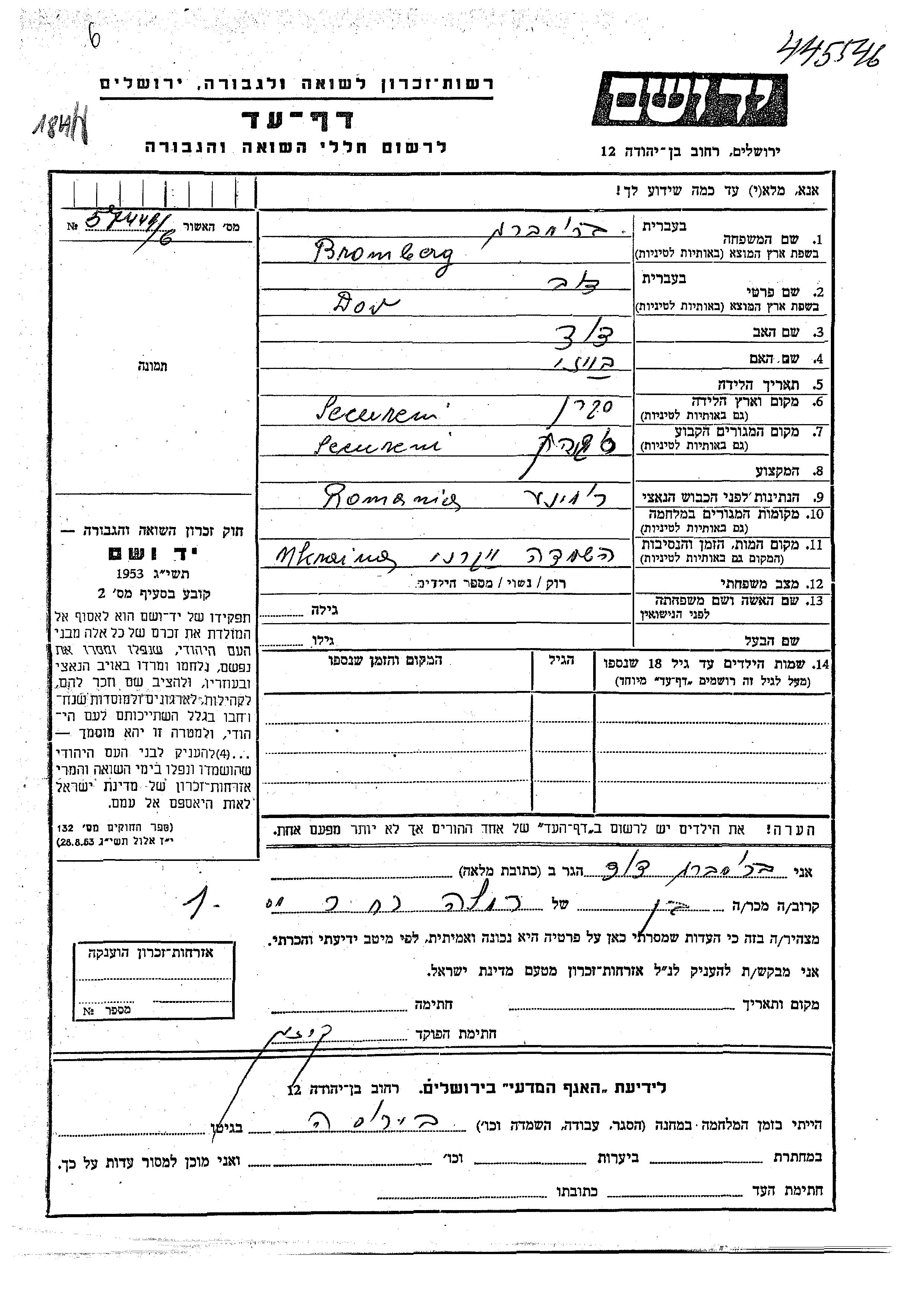 Bromberg Dov Secureni, Rumänien Gedenkblatt