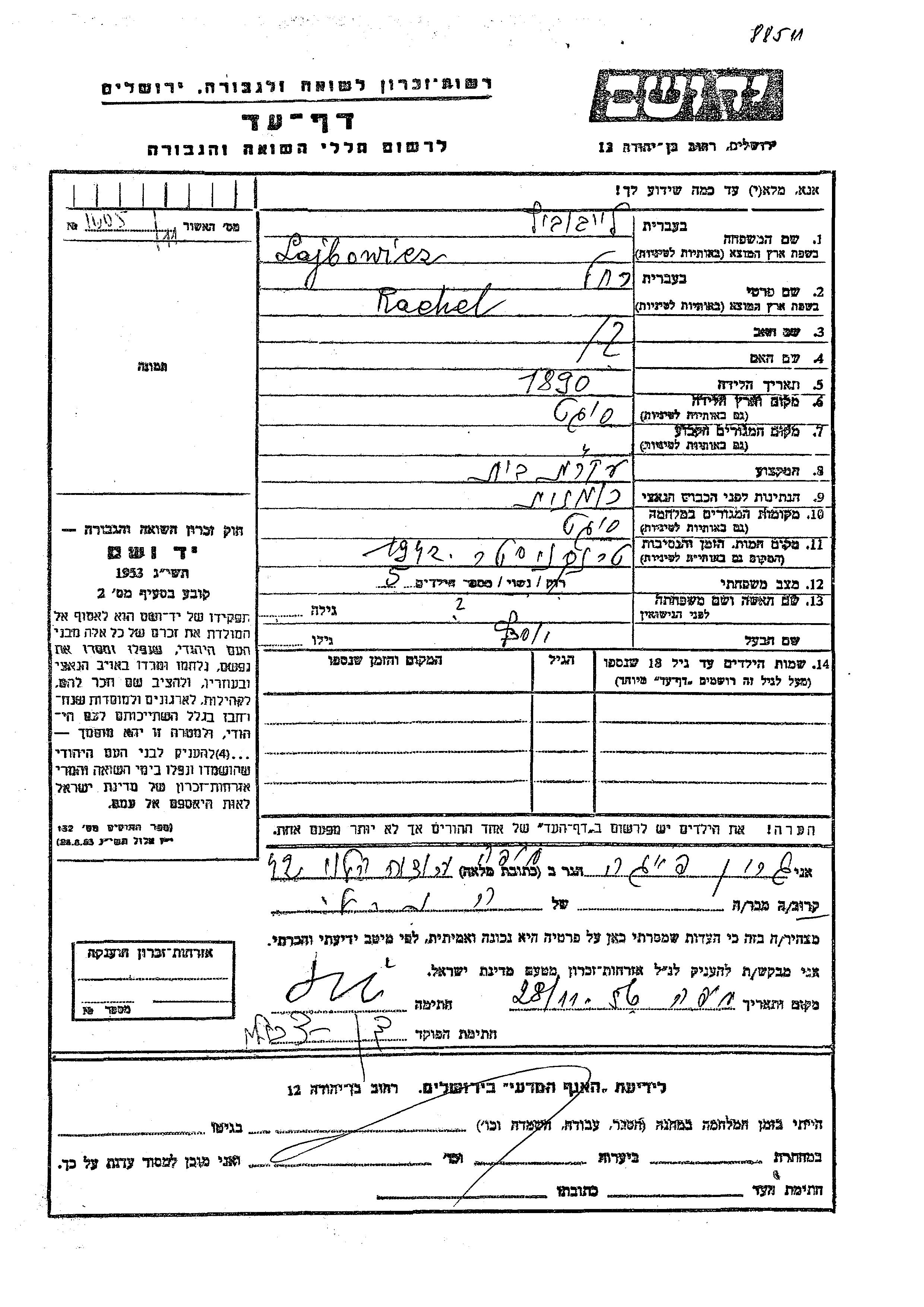 Rachel Lajbowicz wurde im Jahr 1890 in Sighet, Rumänien geboren. Sie war Hausfrau und mit Yosef Verheiratet. Vor dem Zweiten Weltkrieg lebte sie in Sighet, Rumänien. Während des Krieges war sie in Sighet, Rumänien.
