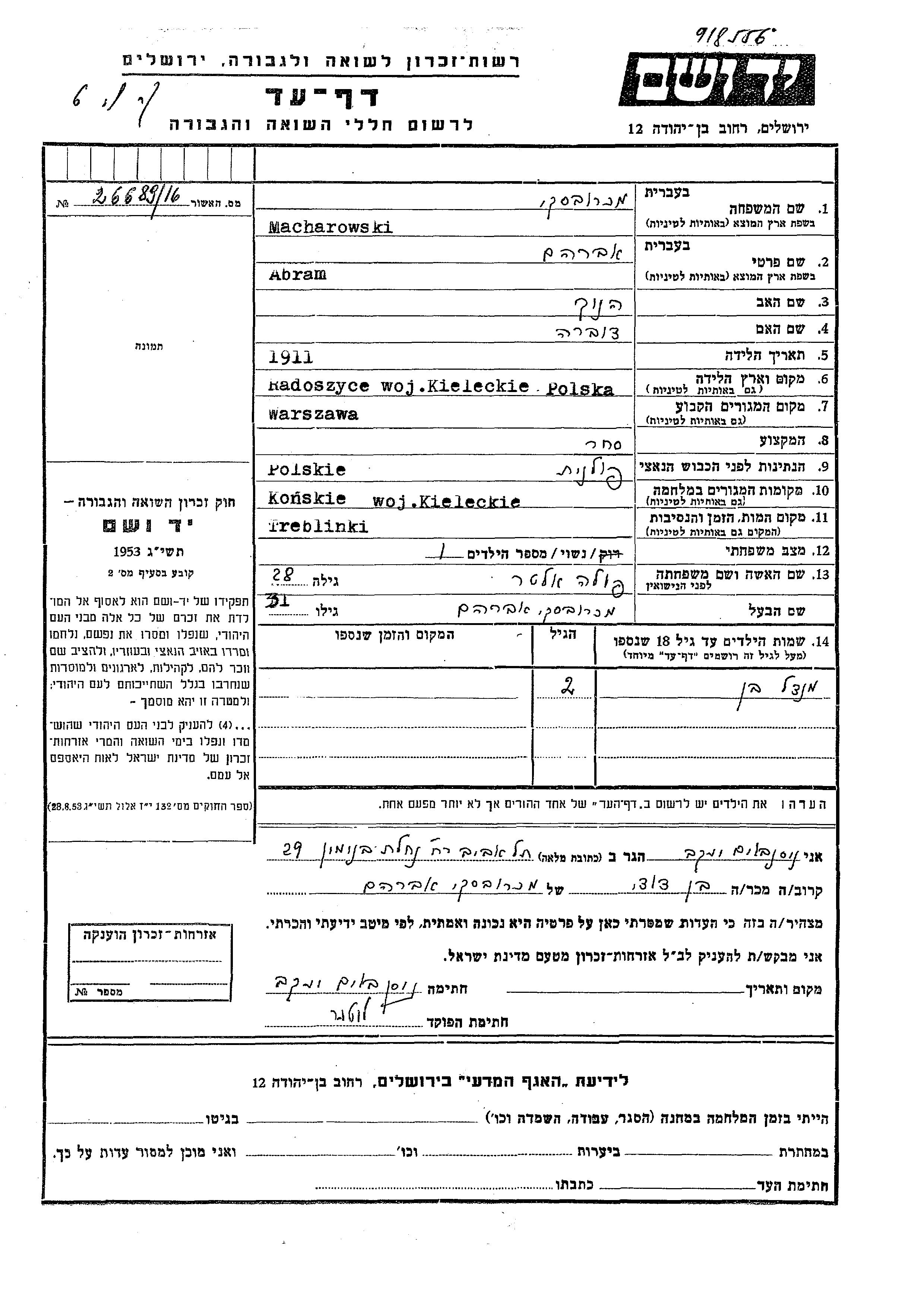 Abram Macharowski wurde im Jahr 1911 in Radoszyce, Polen geboren. Er war der Sohn von Henoch und Dobra. Er war Kaufmann/-frau und mit Pola, geb. Alter Verheiratet. Vor dem Zweiten Weltkrieg lebte er in Varsha, Polen. Während des Krieges war er in Konskie, Polen.