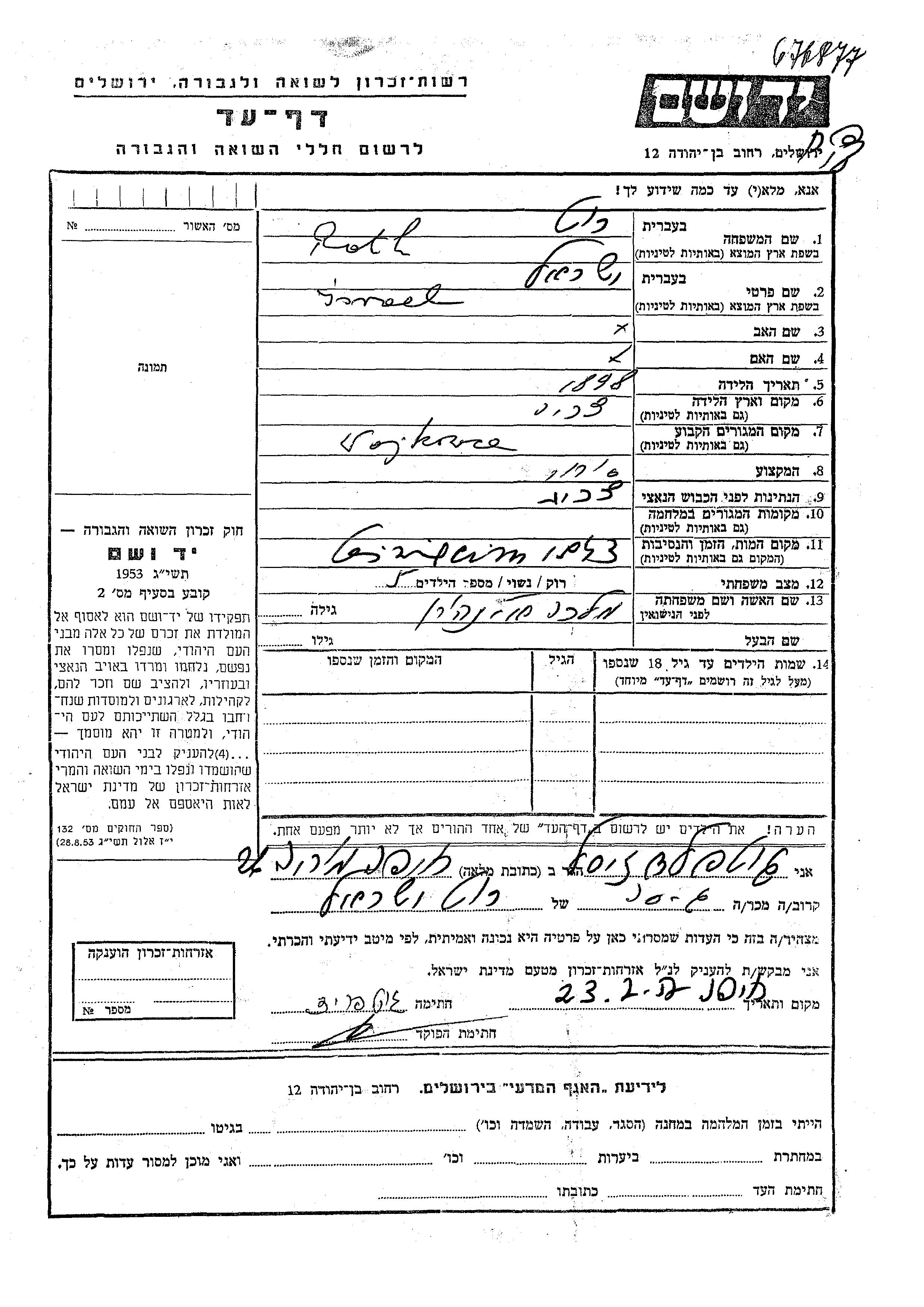 Israel Roth Rut wurde im Jahr 1898 in Tschechoslowakei geboren. Er war Kaufmann/-frau und mit Malka, geb. Einhorn Verheiratet. Vor dem Zweiten Weltkrieg lebte er in Wojkowice, Polen.