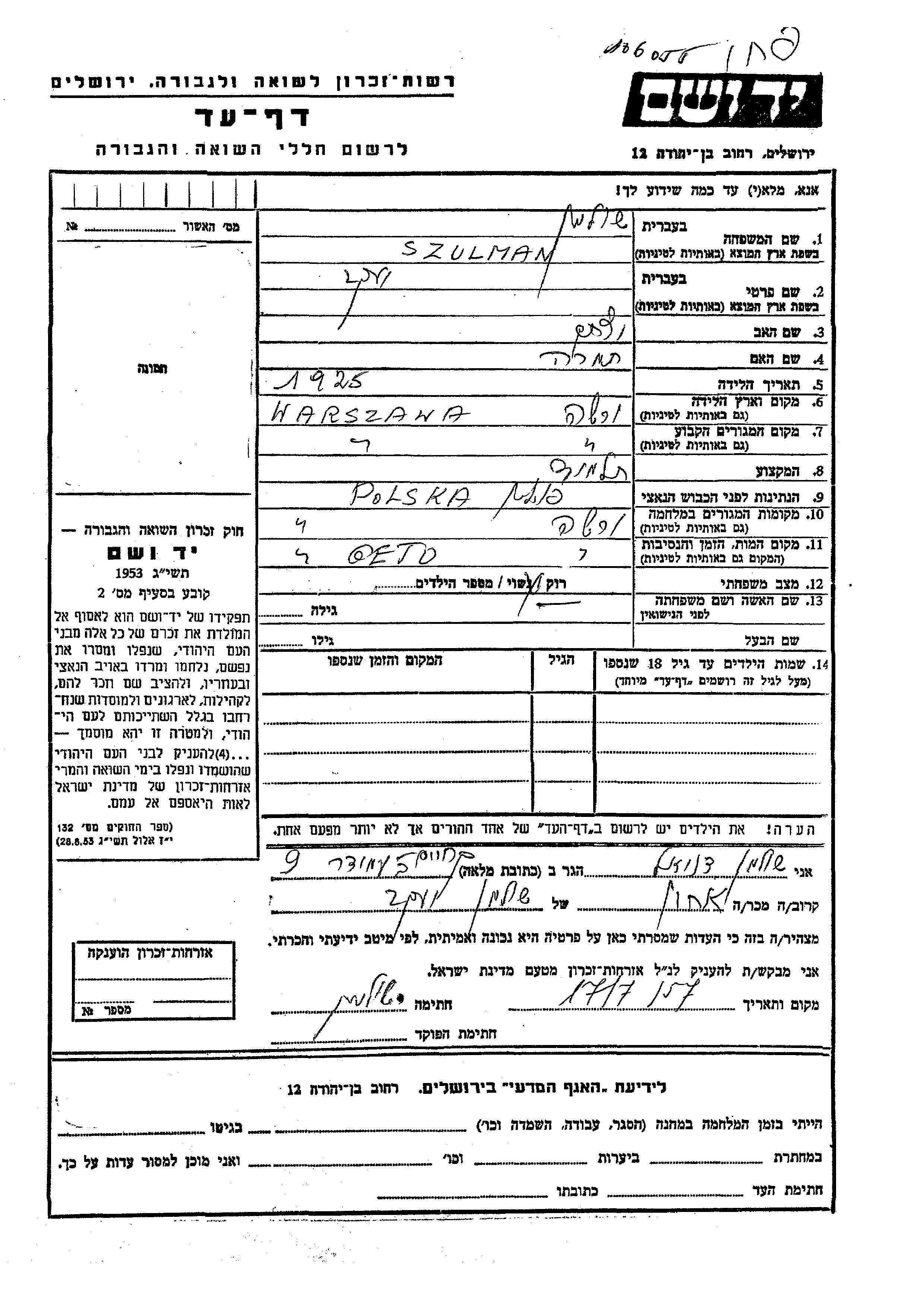Yaakov Szulman wurde im Jahr 1925 in Warsaw, Polen geboren. Er war der Sohn von Yitzkhak und Tamara. Er war Schüler/-in und Ledig. Vor dem Zweiten Weltkrieg lebte er in Warsaw, Polen. Während des Krieges war er in Warsaw, Polen.
