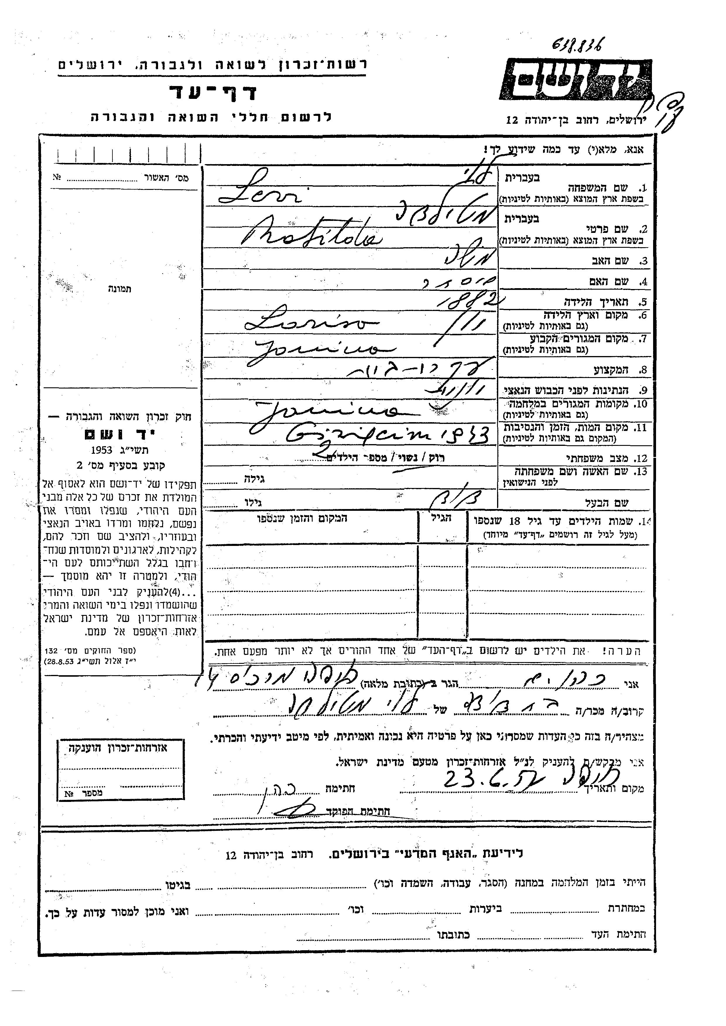 Matilda Levi wurde im Jahr 1882 in Larissa, Griechenland geboren. Sie war die Tochter von Moshe und Ester. Sie war Hausfrau und mit David Verheiratet. Vor dem Zweiten Weltkrieg lebte sie in Janina, Griechenland. Während des Krieges war sie in Janina, Griechenland.