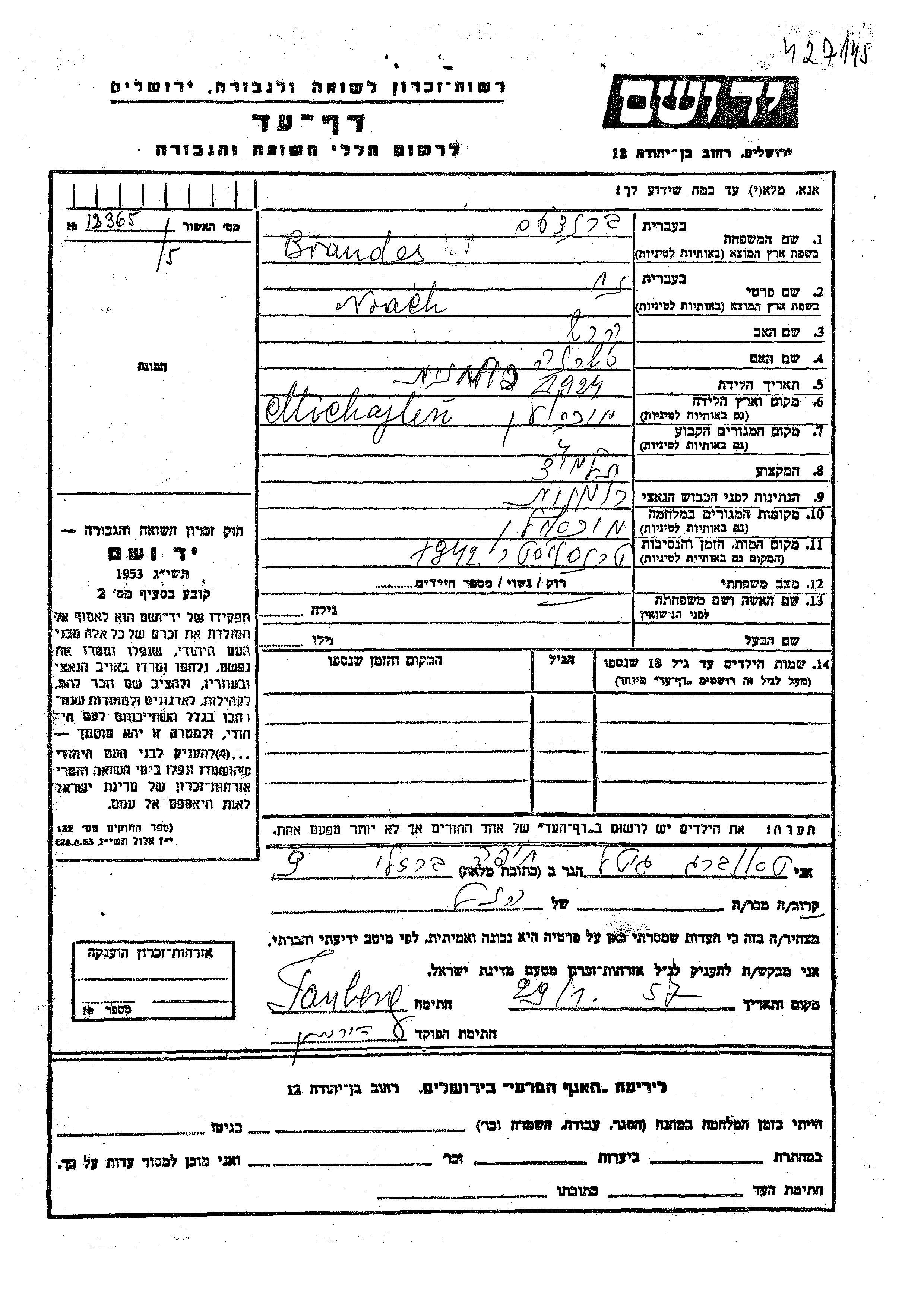 Noach Brandes wurde im Jahr 1924 in Michaelin, Rumänien geboren. Er war der Sohn von Hersh und Charna. Er war Schüler/-in und Ledig. Vor dem Zweiten Weltkrieg lebte er in Michaelin, Rumänien. Während des Krieges war er in Michaelin, Rumänien.