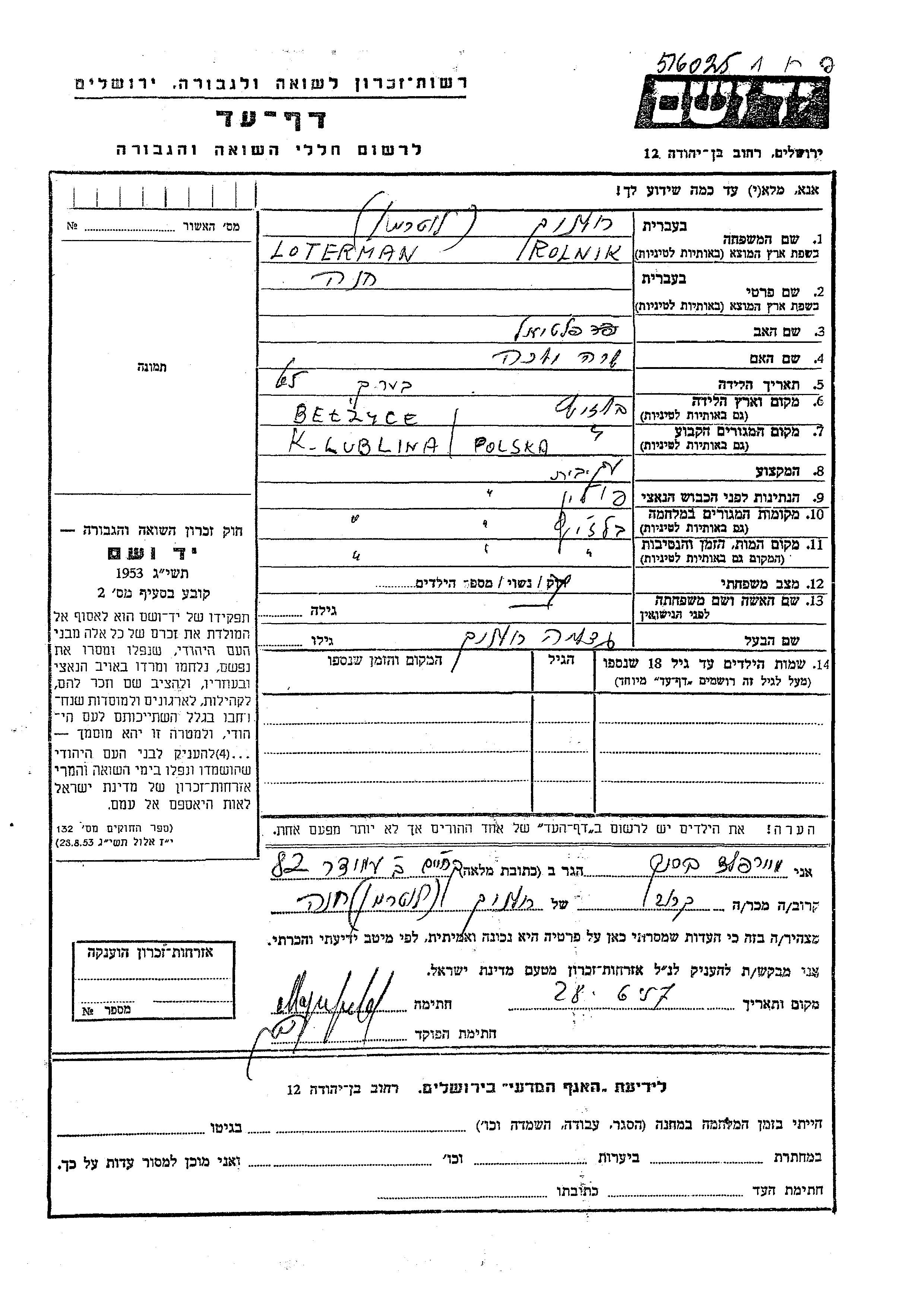 Khana Rolnik, geb. Loterman wurde in Belzyce, Polen geboren. Sie war die Tochter von Paltiel und Sara Malka. Sie war Hausfrau und mit Gedalia Verheiratet. Vor dem Zweiten Weltkrieg lebte sie in Lublin, Polen. Während des Krieges war sie in Belzyce, Polen.