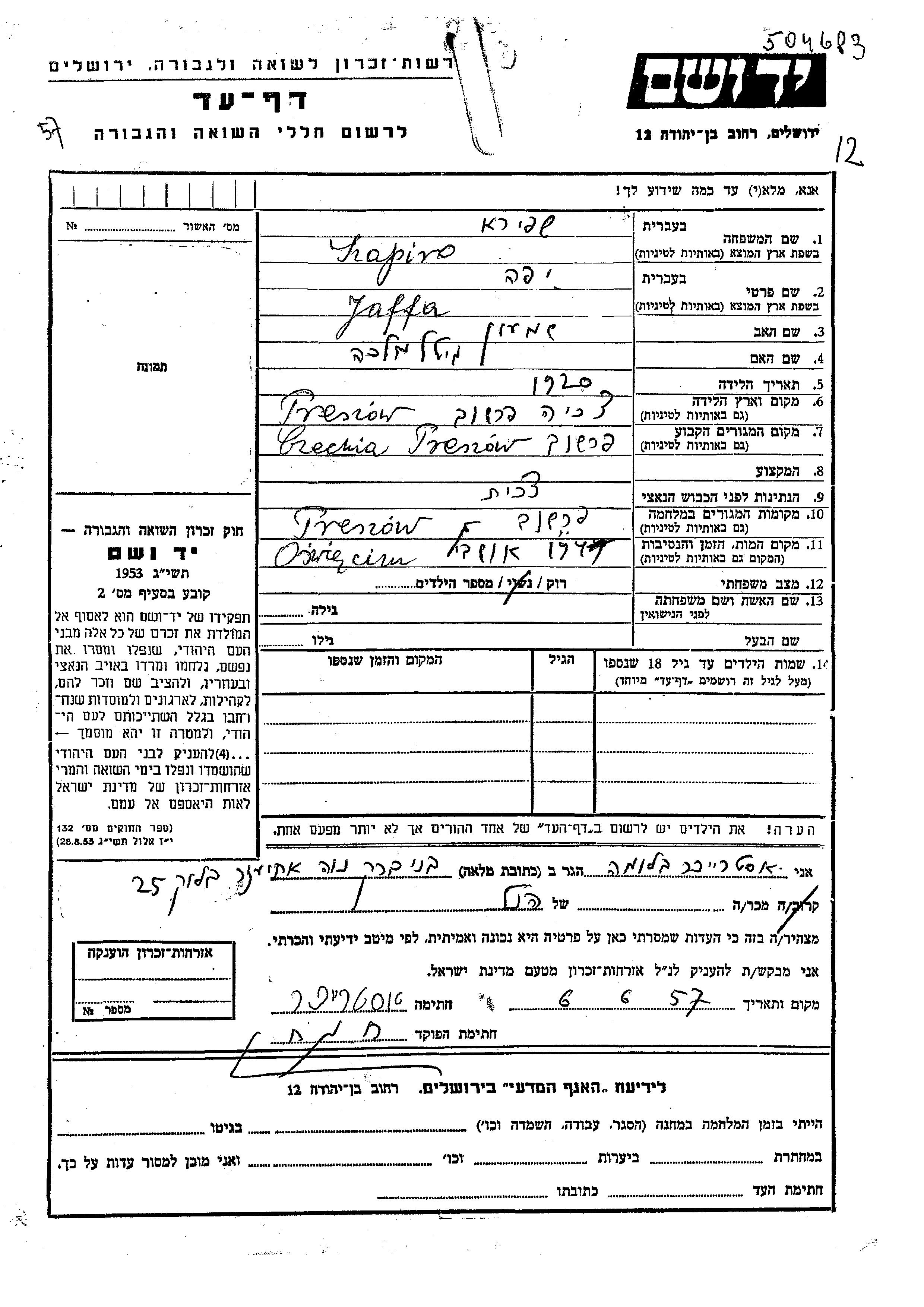Yaffa Shapiro wurde im Jahr 1920 in Preszow, Tschechoslowakei geboren. Sie war die Tochter von Shimon und Gitel Malka. Sie war Ledig. Vor dem Zweiten Weltkrieg lebte sie in Preszow, Tschechoslowakei. Während des Krieges war sie in Preszow, Tschechoslowakei.