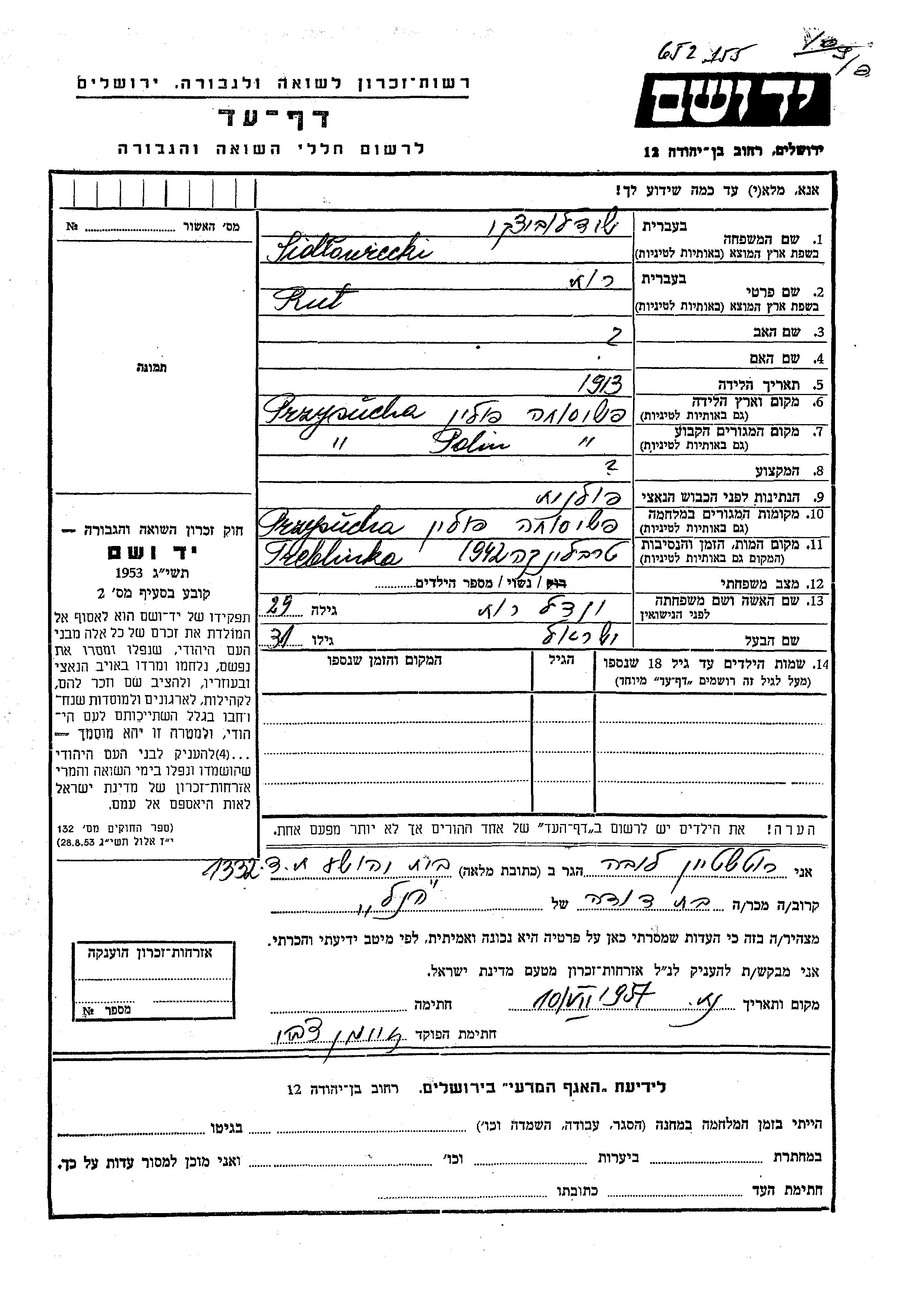 Rut Sidlowicki, geb. Iudel wurde im Jahr 1913 in Przysucha, Polen geboren. Sie war mit Yisrael Verheiratet. Vor dem Zweiten Weltkrieg lebte sie in Przysucha, Polen. Während des Krieges war sie in Przysucha, Polen.