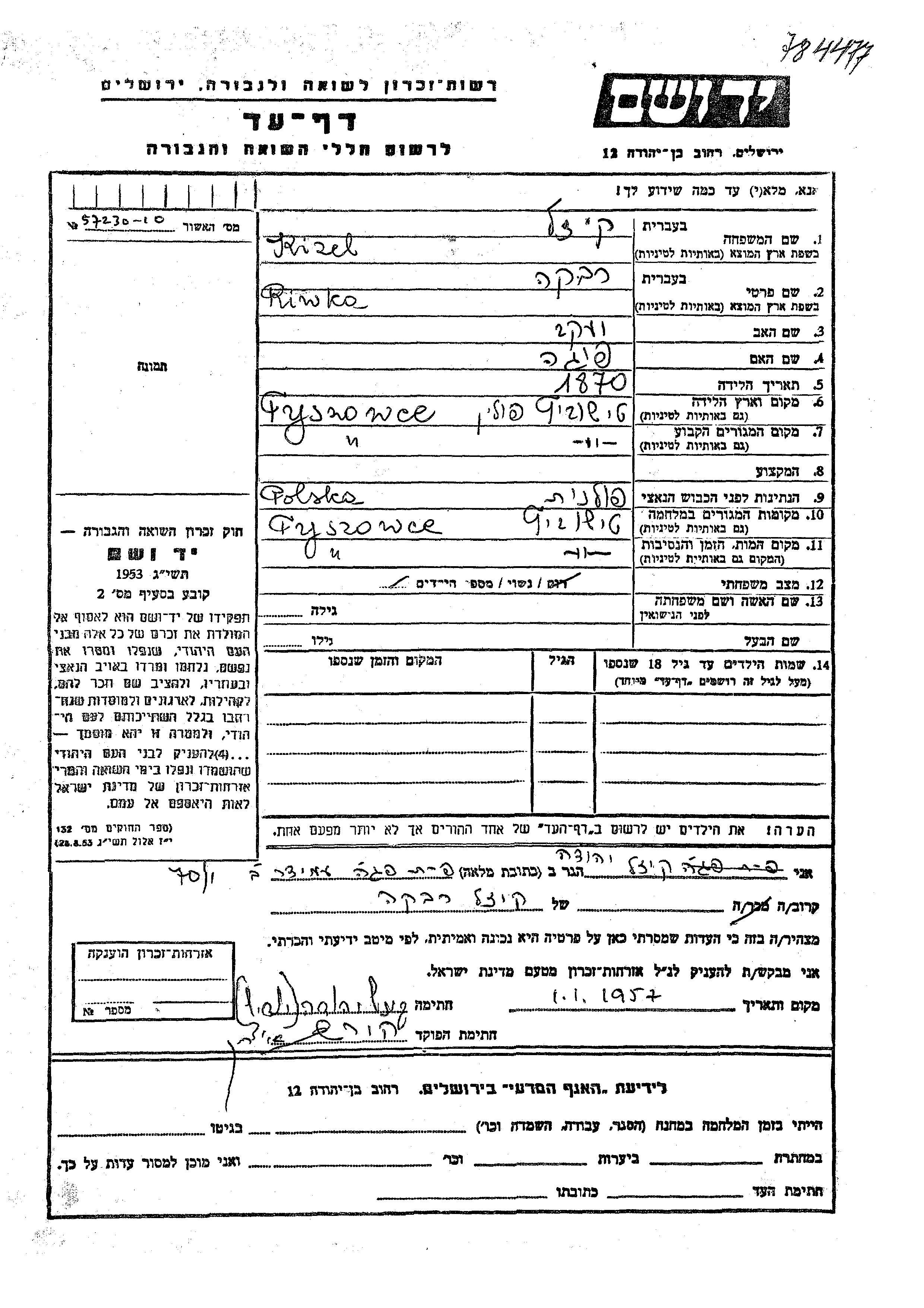 Riwka Kizel wurde im Jahr 1870 in Tyszowce, Polen geboren. Sie war die Tochter von Yaakov und Feiga. Sie war Verheiratet. Vor dem Zweiten Weltkrieg lebte sie in Tyszowce, Polen. Während des Krieges war sie in Tyszowce, Polen.