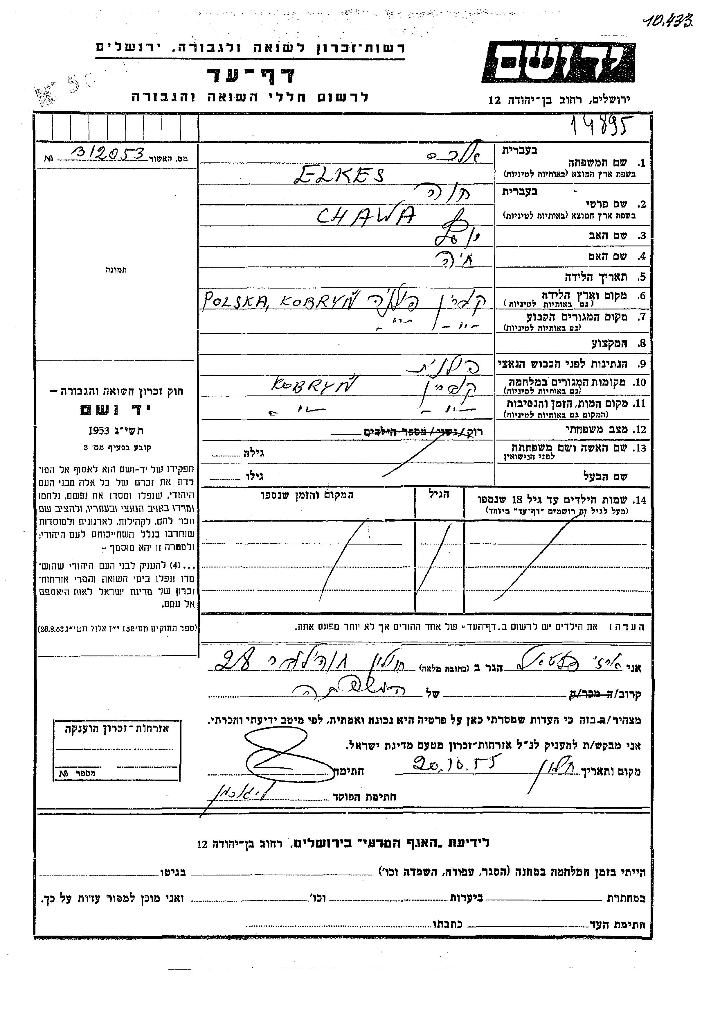 Chawa wurde in der Schoah ermordet. Todesort: Kobryn, Polen.