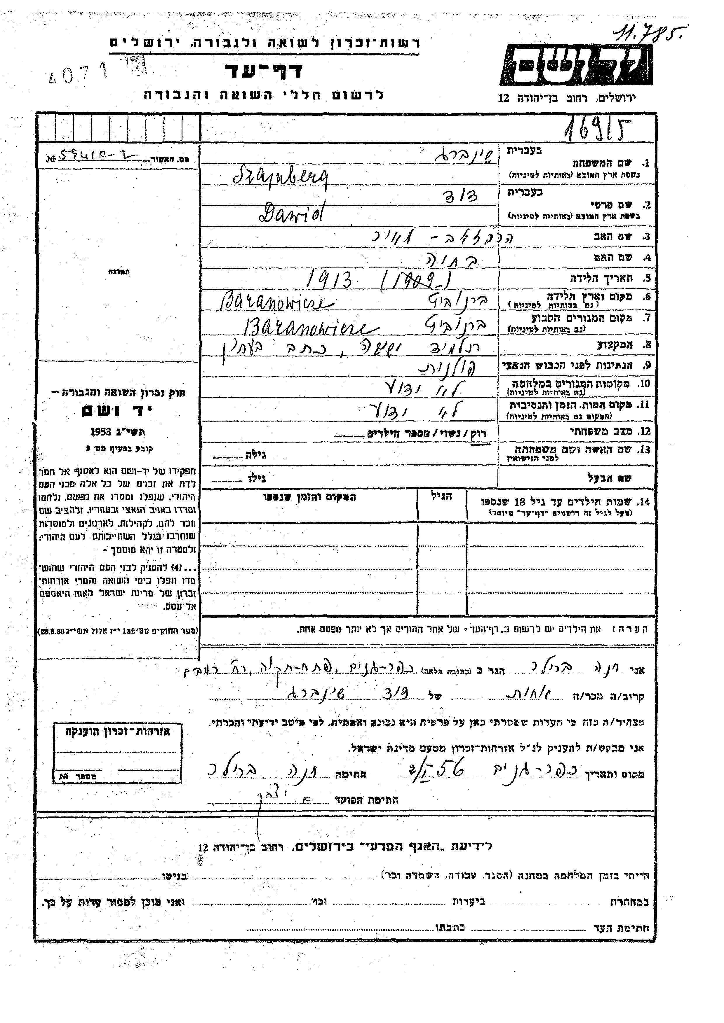 Szajnberg Dawid 1913 Baranowicze, Polen Gedenkblatt
