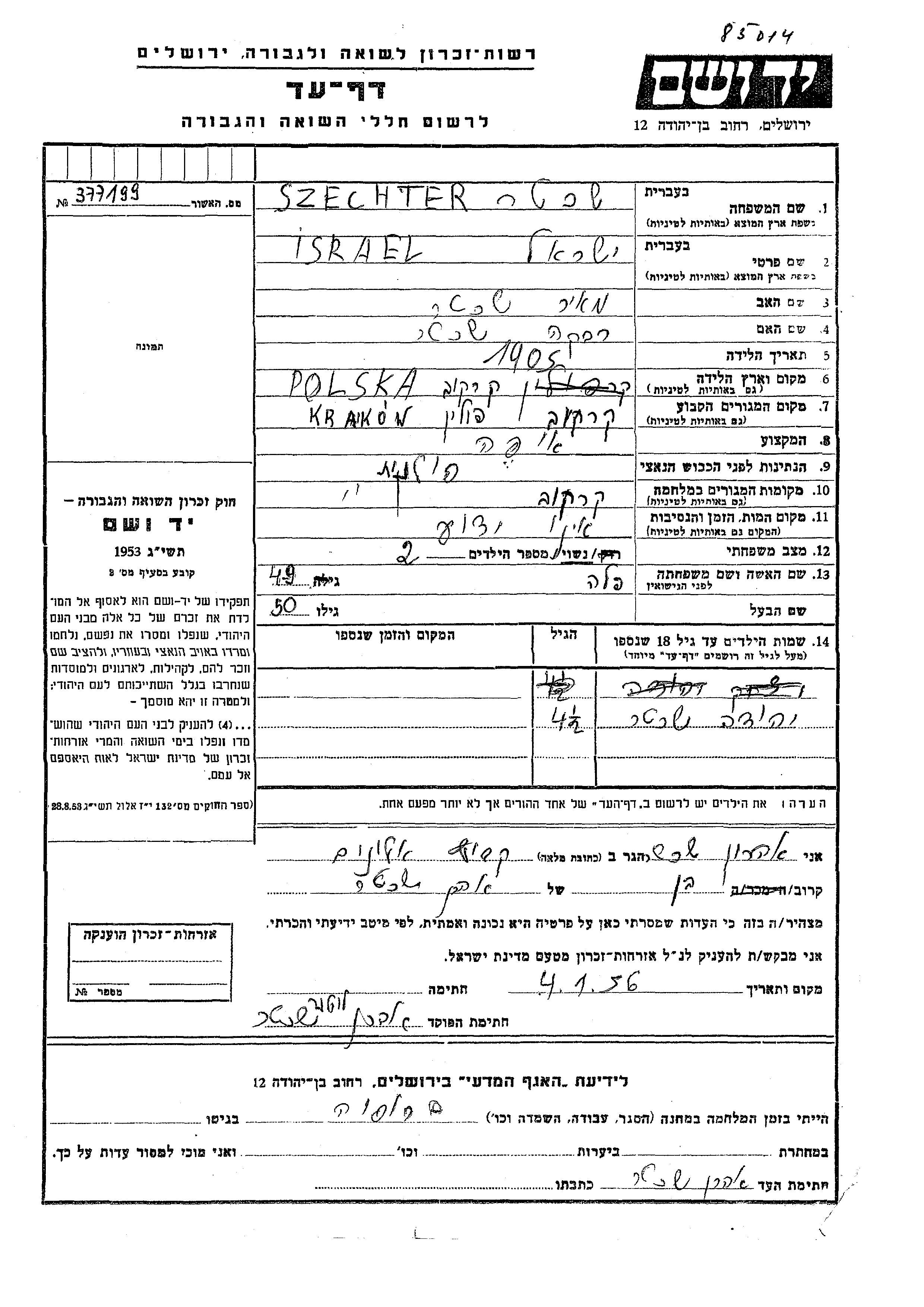Israel Szechter wurde im Jahr 1905 in Krakow, Polen geboren. Er war der Sohn von Meir und Rivka. Er war Bäcker/-in und mit Fela Verheiratet. Vor dem Zweiten Weltkrieg lebte er in Krakow, Polen. Während des Krieges war er in Krakow, Polen.
