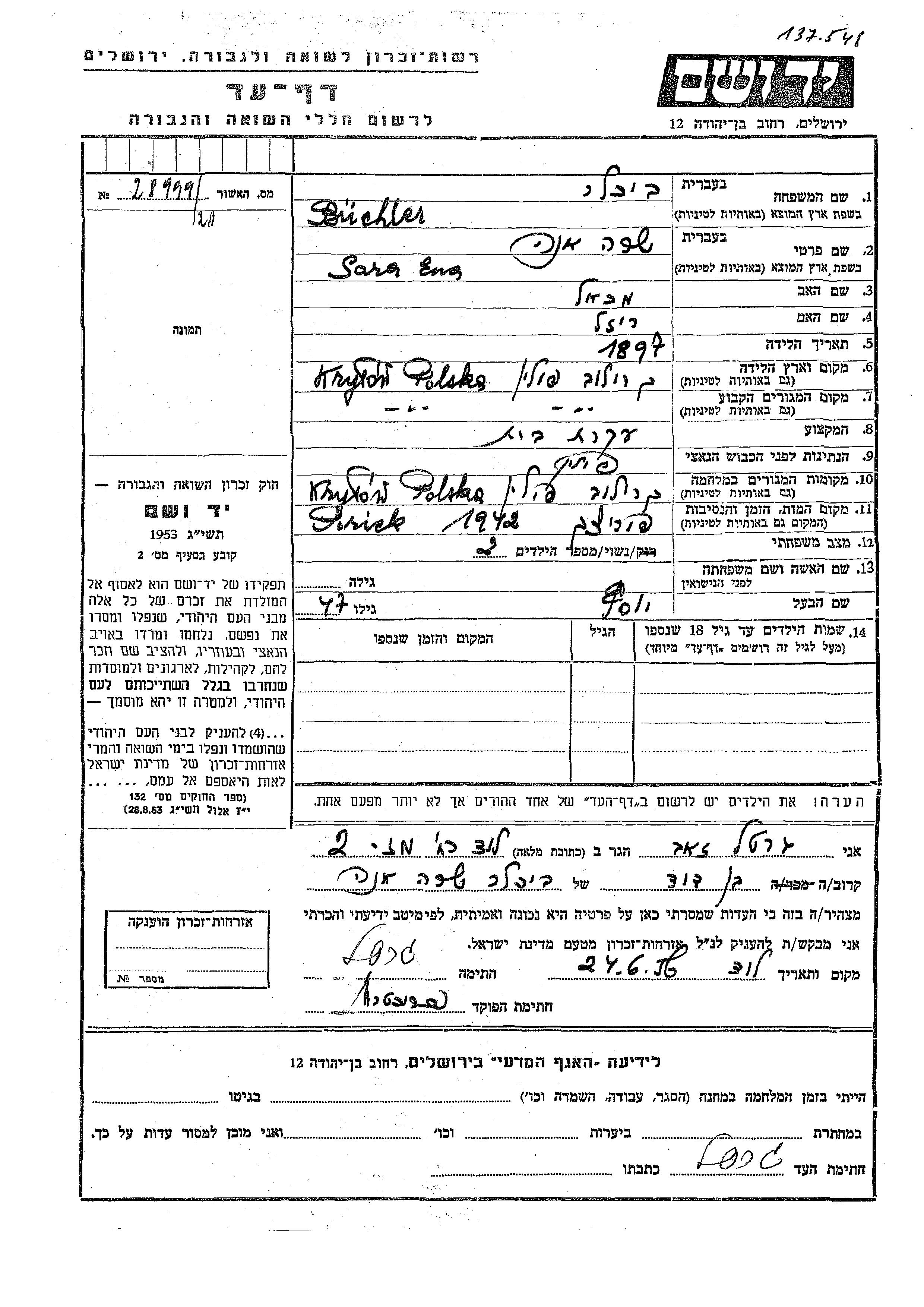 Ena Sara Buchler wurde im Jahr 1897 in Krylow, Polen geboren. Sie war die Tochter von Mekhael und Reizel. Sie war Hausfrau und mit Yosef Verheiratet. Vor dem Zweiten Weltkrieg lebte sie in Krylow, Polen. Während des Krieges war sie in Krylow, Polen.