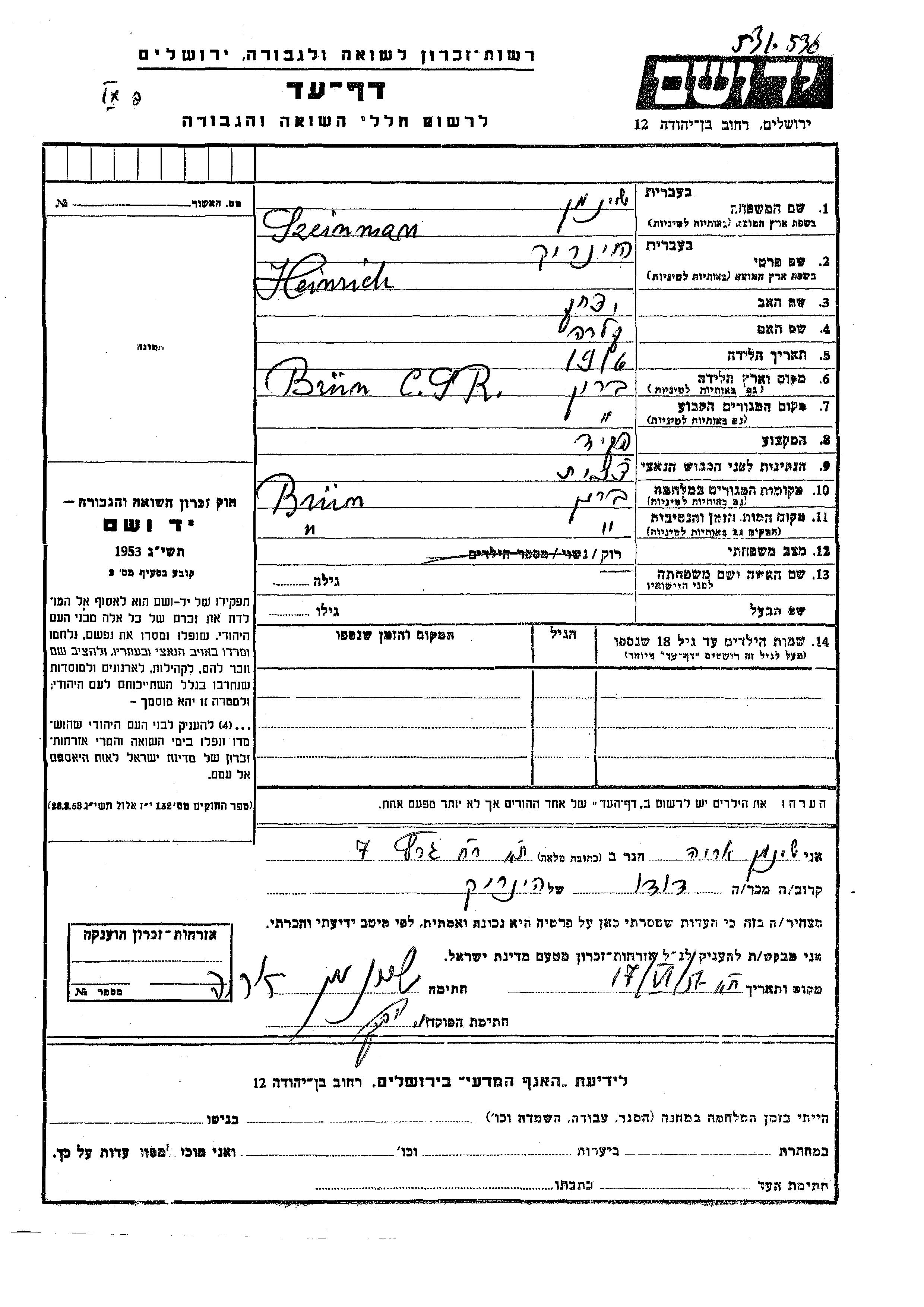 Heinrich Szeinman wurde im Jahr 1916 in Brno, Tschechoslowakei geboren. Er war der Sohn von Yitzkhak und Klara. Er war Angestellte/-r und Ledig. Vor dem Zweiten Weltkrieg lebte er in Brno, Tschechoslowakei. Während des Krieges war er in Brno, Tschechoslowakei.