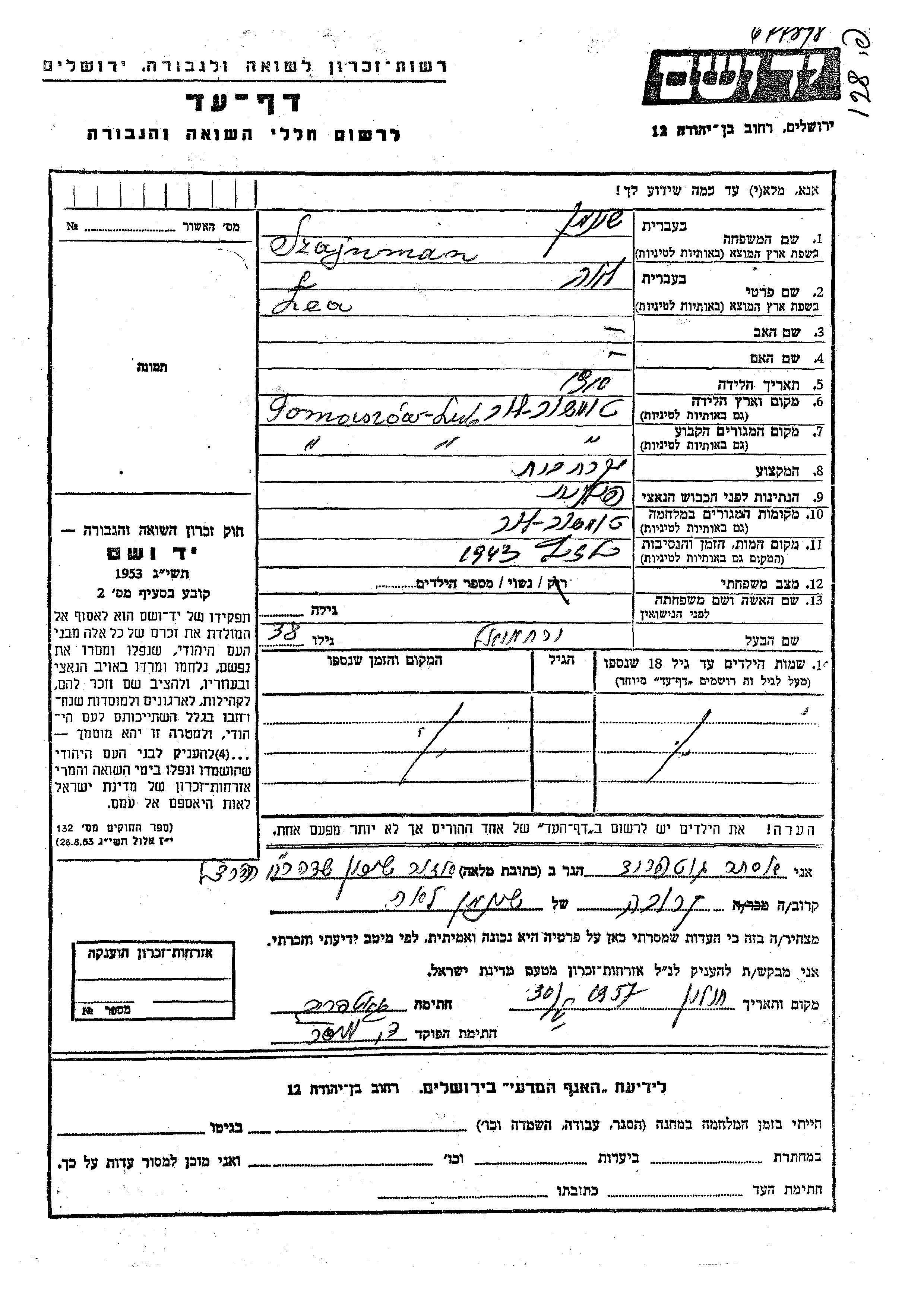 Lea Szajnman wurde im Jahr 1910 in Tomaszow, Polen geboren. Sie war Hausfrau und mit Yerakhmiel Verheiratet. Vor dem Zweiten Weltkrieg lebte sie in Tomaszow, Polen. Während des Krieges war sie in Tomaszow, Polen.