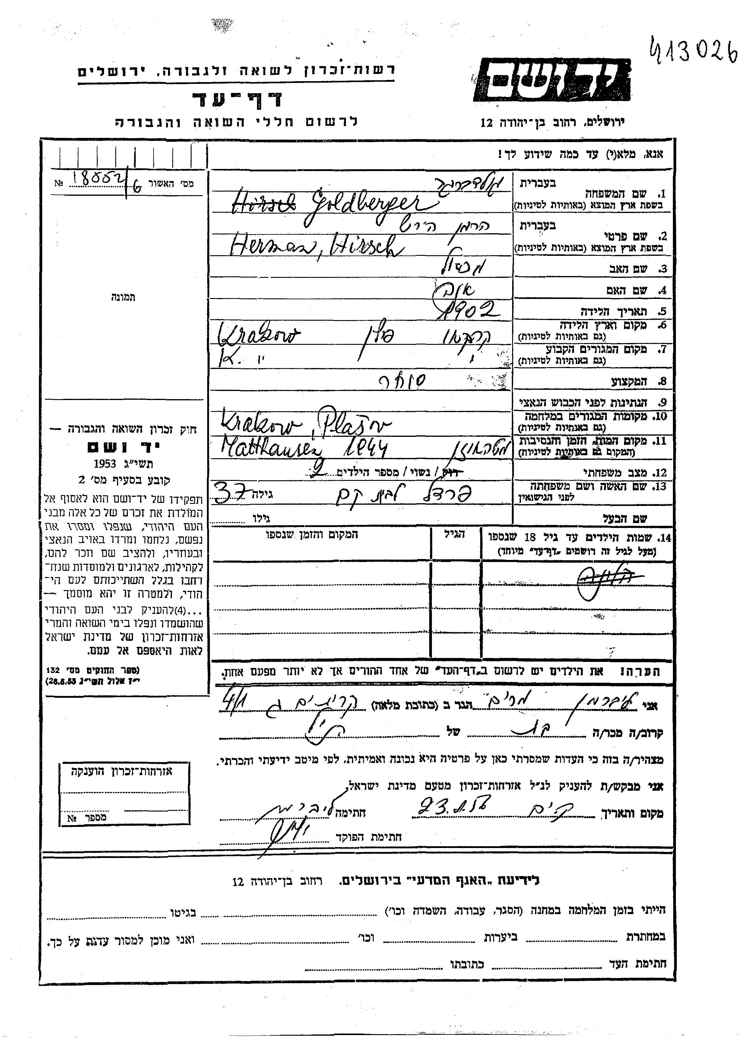 Hirsch Herman Goldberger wurde im Jahr 1902 in Krakow, Polen geboren. Er war der Sohn von Mikhael und Ana. Er war Kaufmann/-frau und mit Fradel, geb. Kam Verheiratet. Vor dem Zweiten Weltkrieg lebte er in Krakow, Polen. Während des Krieges war er in Plaszow, Polen.
