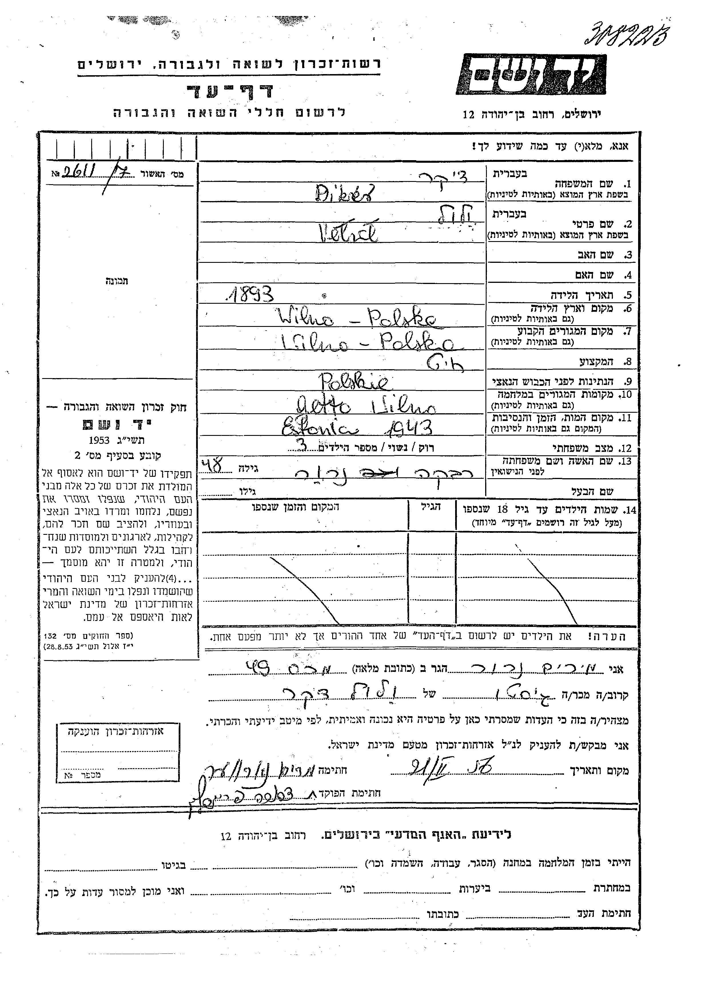 Velvl Diker wurde im Jahr 1893 in Wilno, Polen geboren. Er war Schneider und mit Rivka, geb. Narver Verheiratet. Vor dem Zweiten Weltkrieg lebte er in Wilno, Polen. Während des Krieges war er in Wilno, Polen.