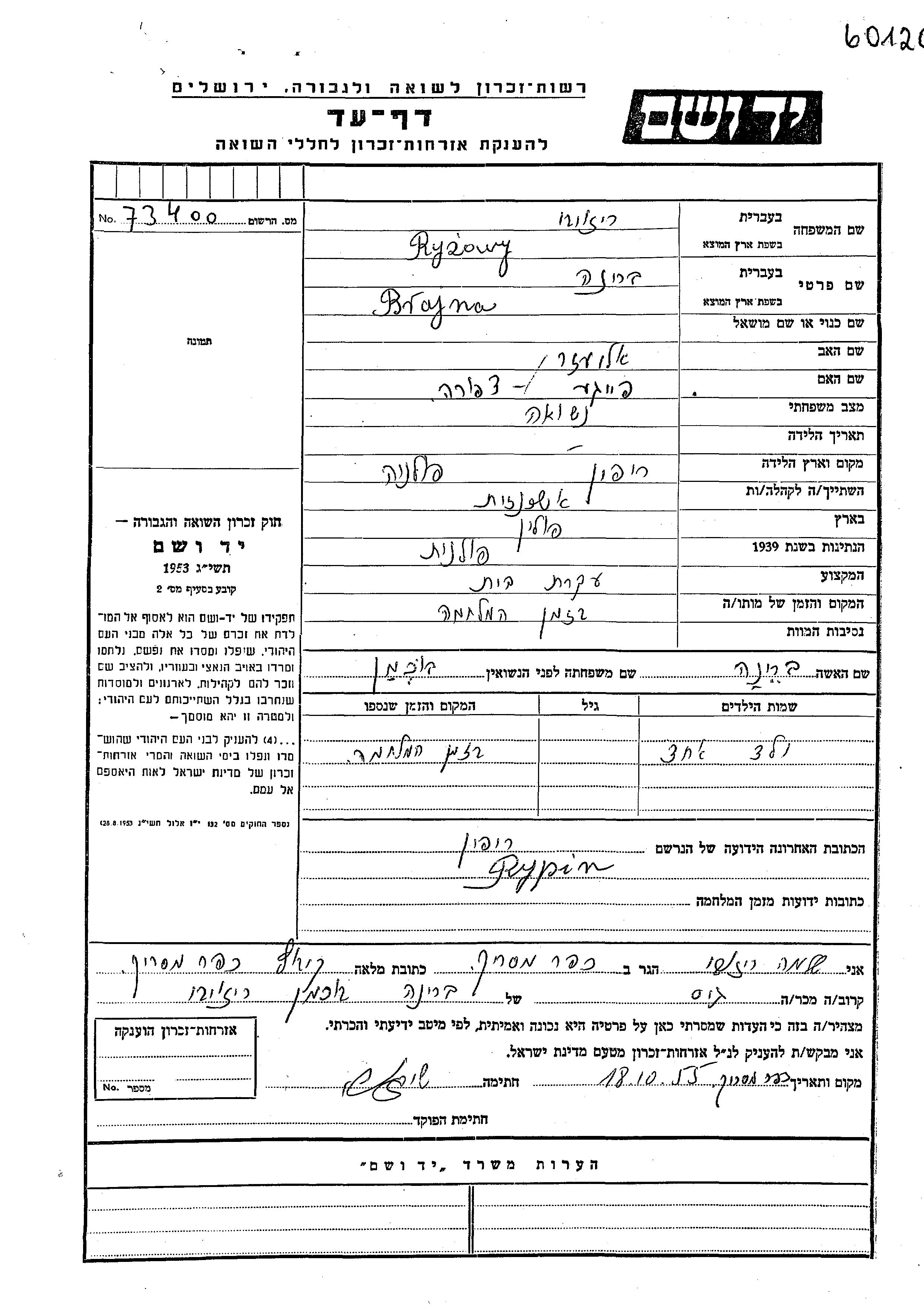 Brajna Ryzowy, geb. Bukhman wurde in Rypin, Polen geboren. Sie war die Tochter von Eliezer und Feige Tzipora. Sie war Hausfrau und Verheiratet. Vor dem Zweiten Weltkrieg lebte sie in Polen. Während des Krieges war sie in Rypin, Polen.