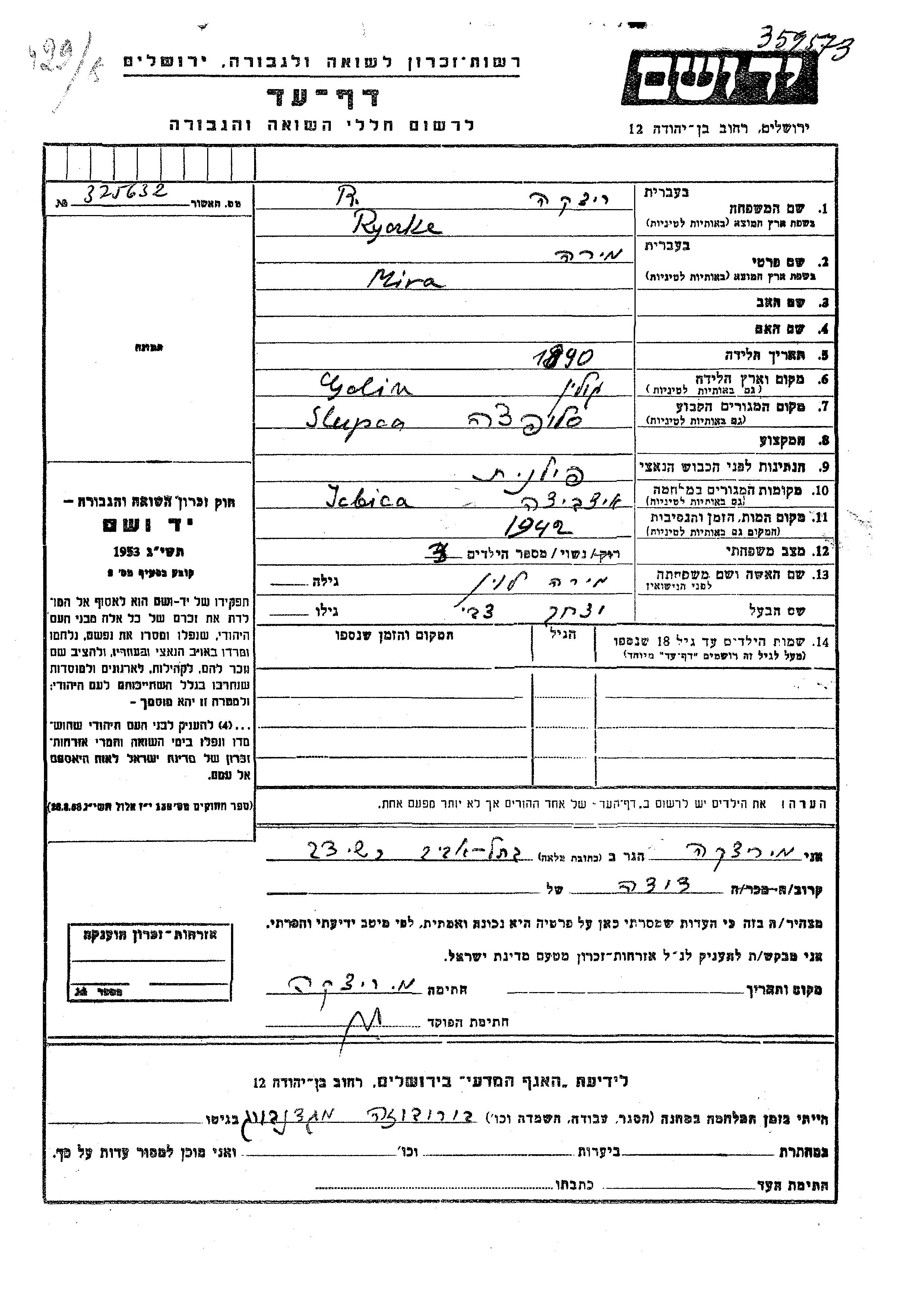 Mira Ryczke, geb. Levin wurde im Jahr 1890 in Golin, Polen geboren. Sie war mit Yitzkhak Tzvi Verheiratet. Vor dem Zweiten Weltkrieg lebte sie in Slupca, Polen. Während des Krieges war sie in Izbica, Polen.