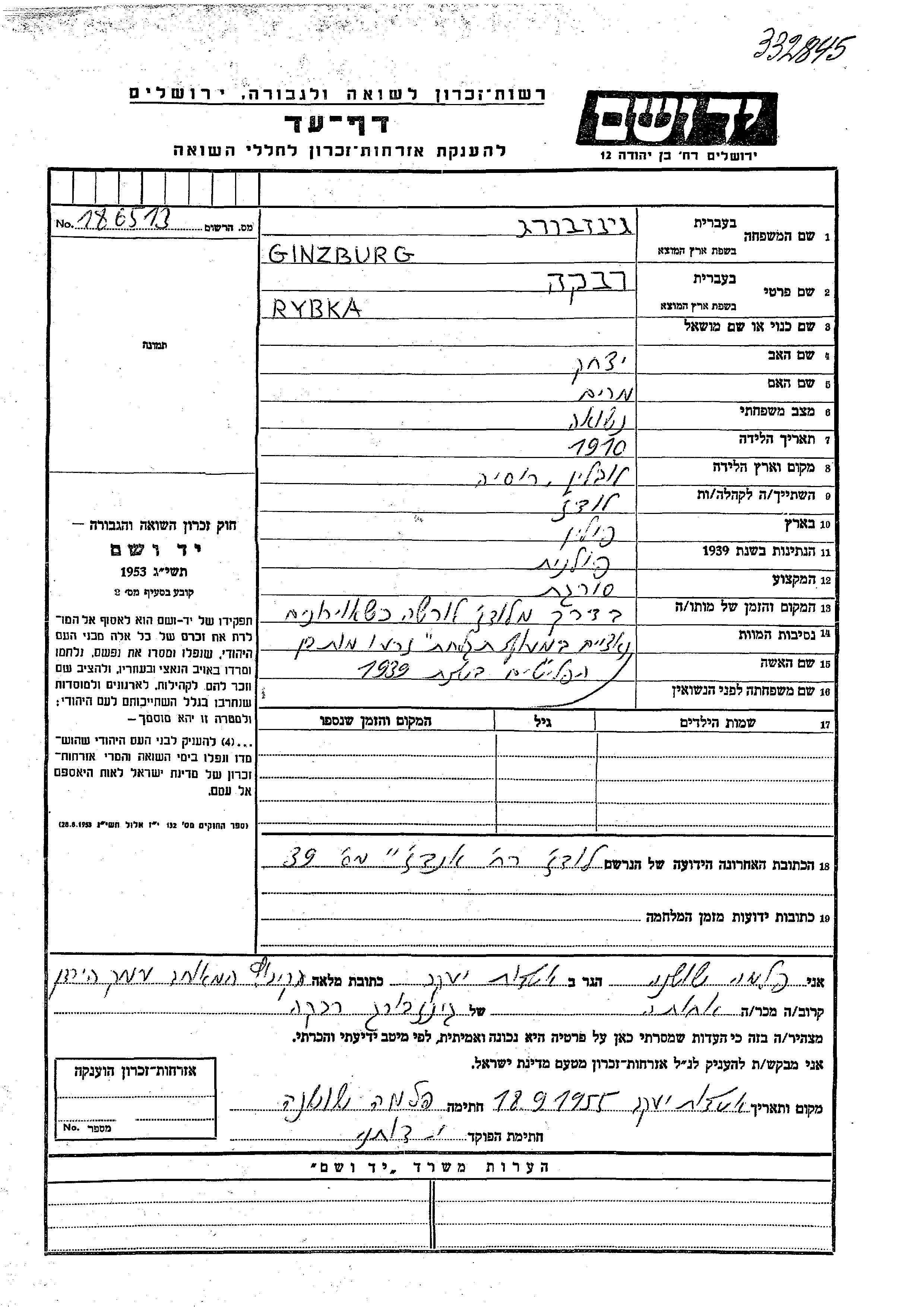 Rybka wurde in der Schoah ermordet. Todesort: unbekannt im Jahr 1939.