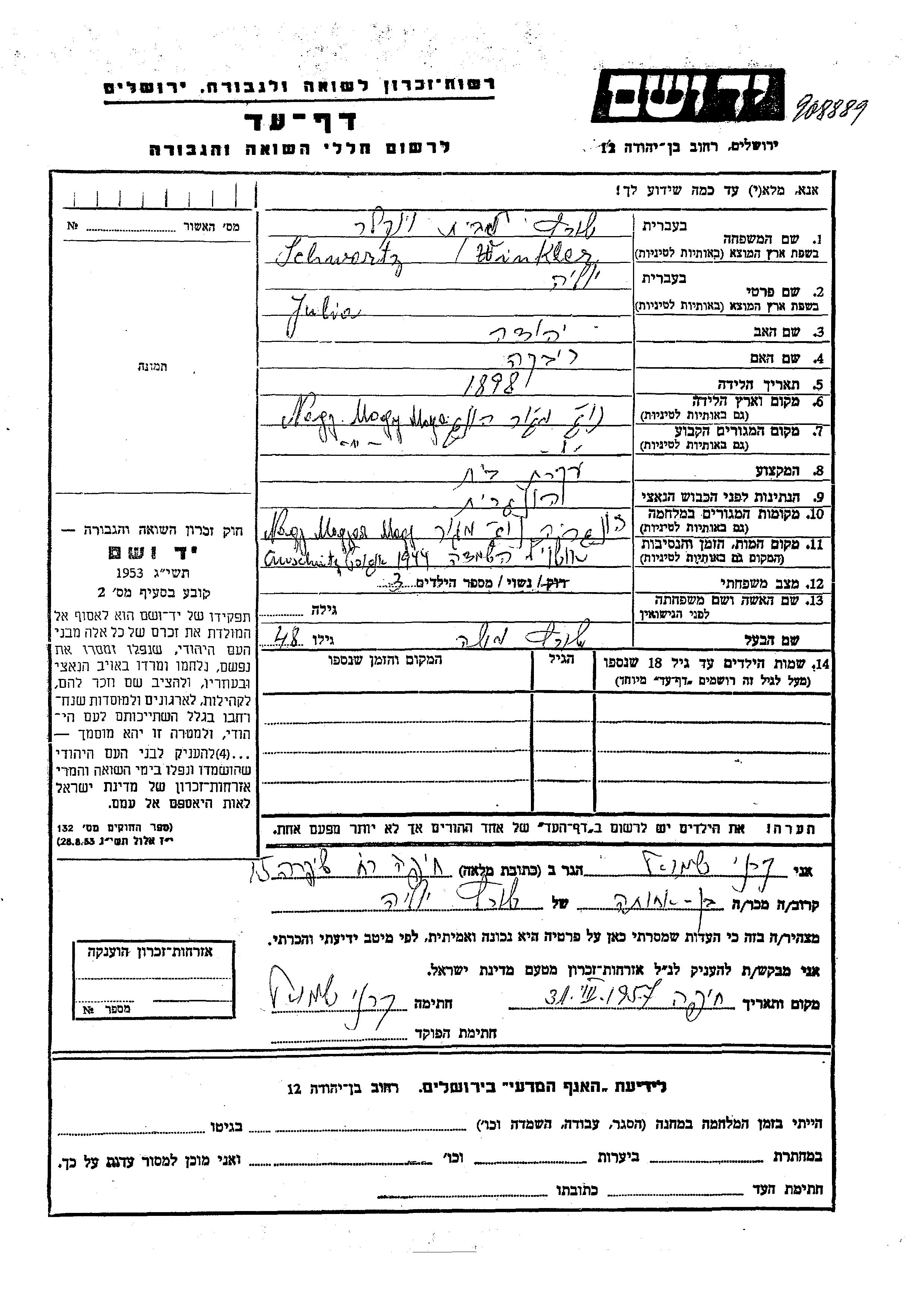 Julia Schwartz, geb. Winkler wurde im Jahr 1898 in Nagymegyer, Ungarn geboren. Sie war die Tochter von Yehuda und Rivka. Sie war Hausfrau und mit Moshe Verheiratet. Vor dem Zweiten Weltkrieg lebte sie in Nagymegyer, Ungarn. Während des Krieges war sie in Nagymegyer, Ungarn.