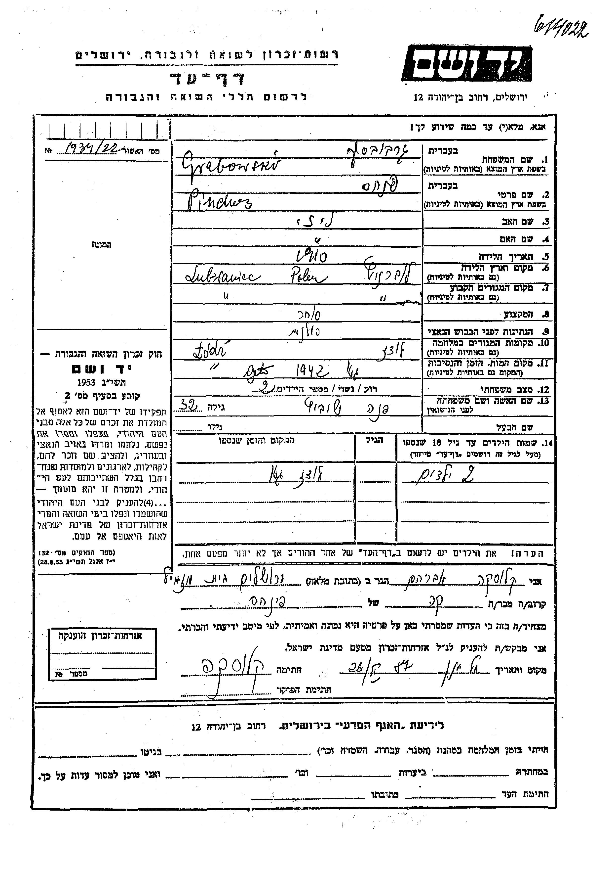 Grabowski Pinchas 1910 Lubraniec, Polen Gedenkblatt
