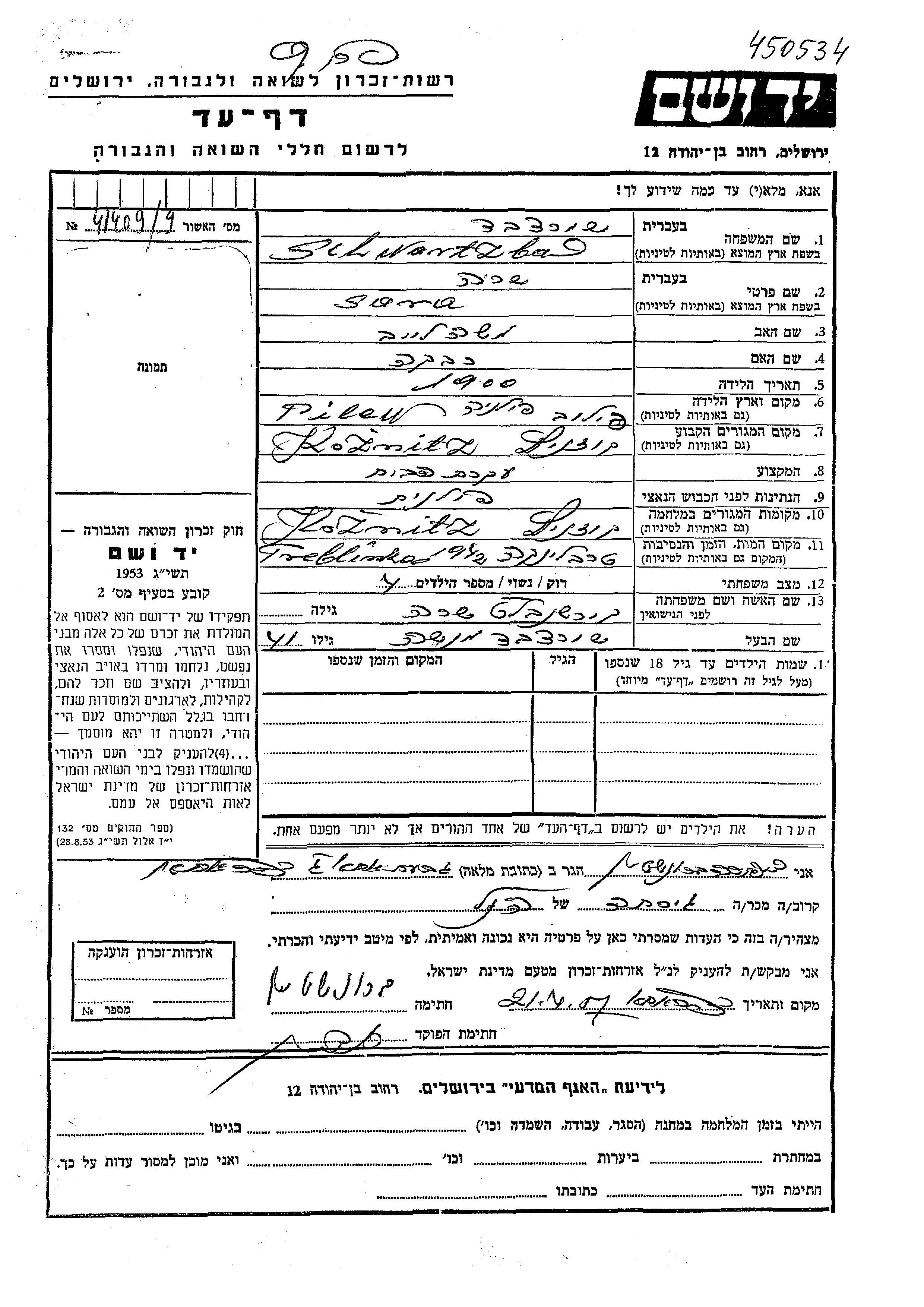 Sara Schwartzbad, geb. Kirshenblat wurde im Jahr 1900 in Pilov, Polen geboren. Sie war die Tochter von Moshe Leib und Rivka. Sie war Hausfrau und mit Menashe Verheiratet. Vor dem Zweiten Weltkrieg lebte sie in Koznitz, Polen. Während des Krieges war sie in Koznitz, Polen.