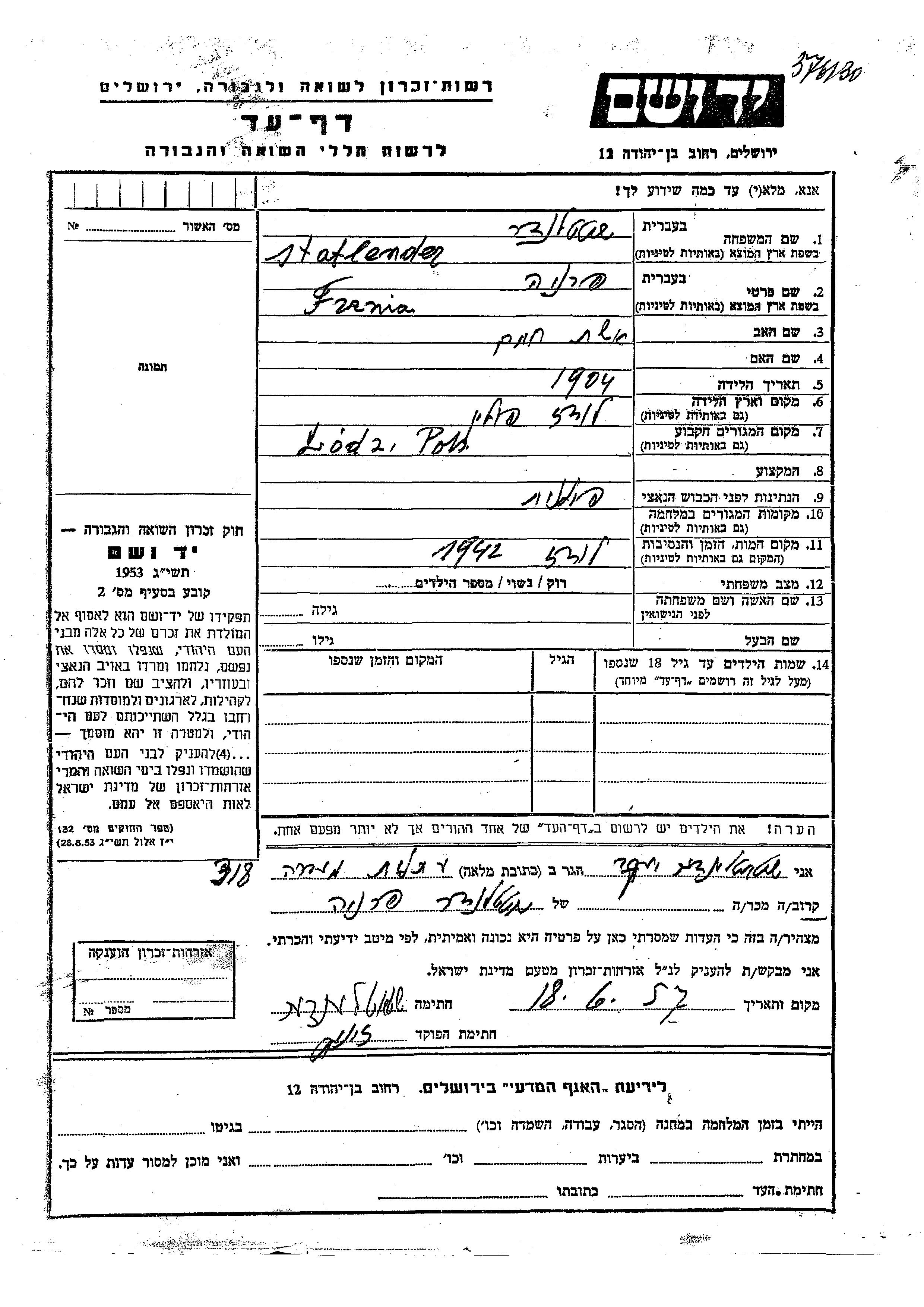 Frenia Statlender wurde im Jahr 1904 in Lodz, Polen geboren. Sie war die Tochter von Khaim. Vor dem Zweiten Weltkrieg lebte sie in Lodz, Polen.