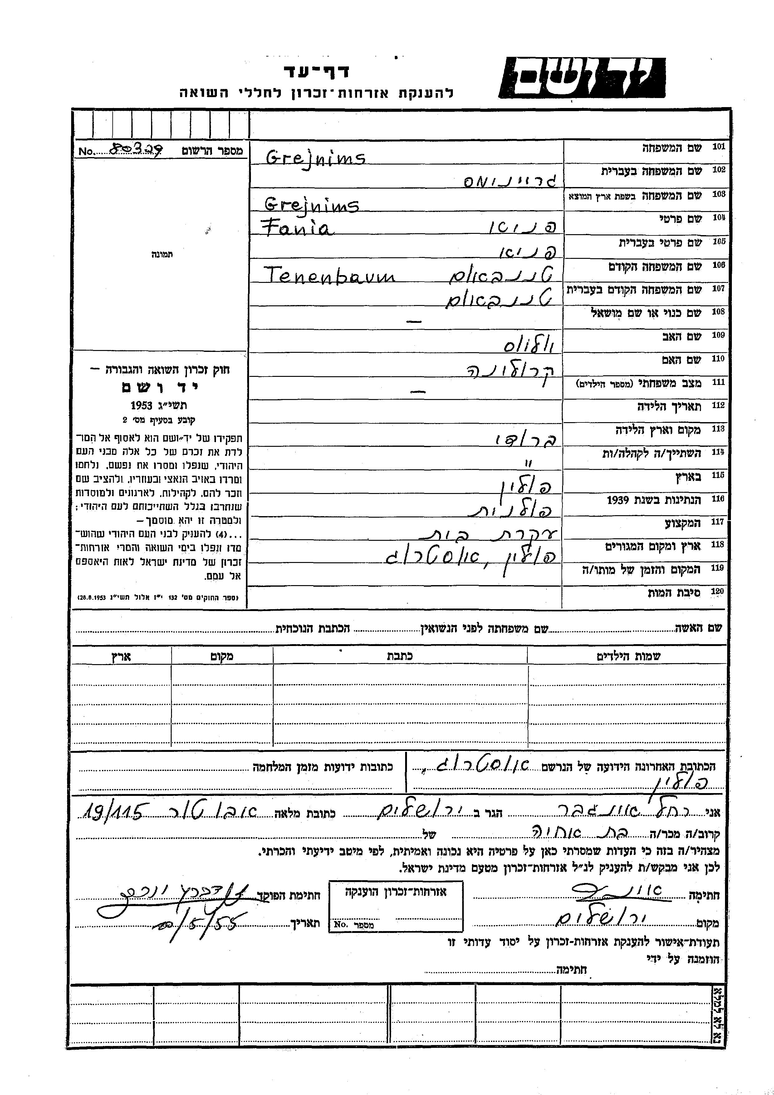 Fania Grejnims, geb. Tenenbaum wurde in Brody, Polen geboren. Sie war die Tochter von Elius und Karolina. Sie war Hausfrau. Während des Krieges war sie in Ostrog, Polen.