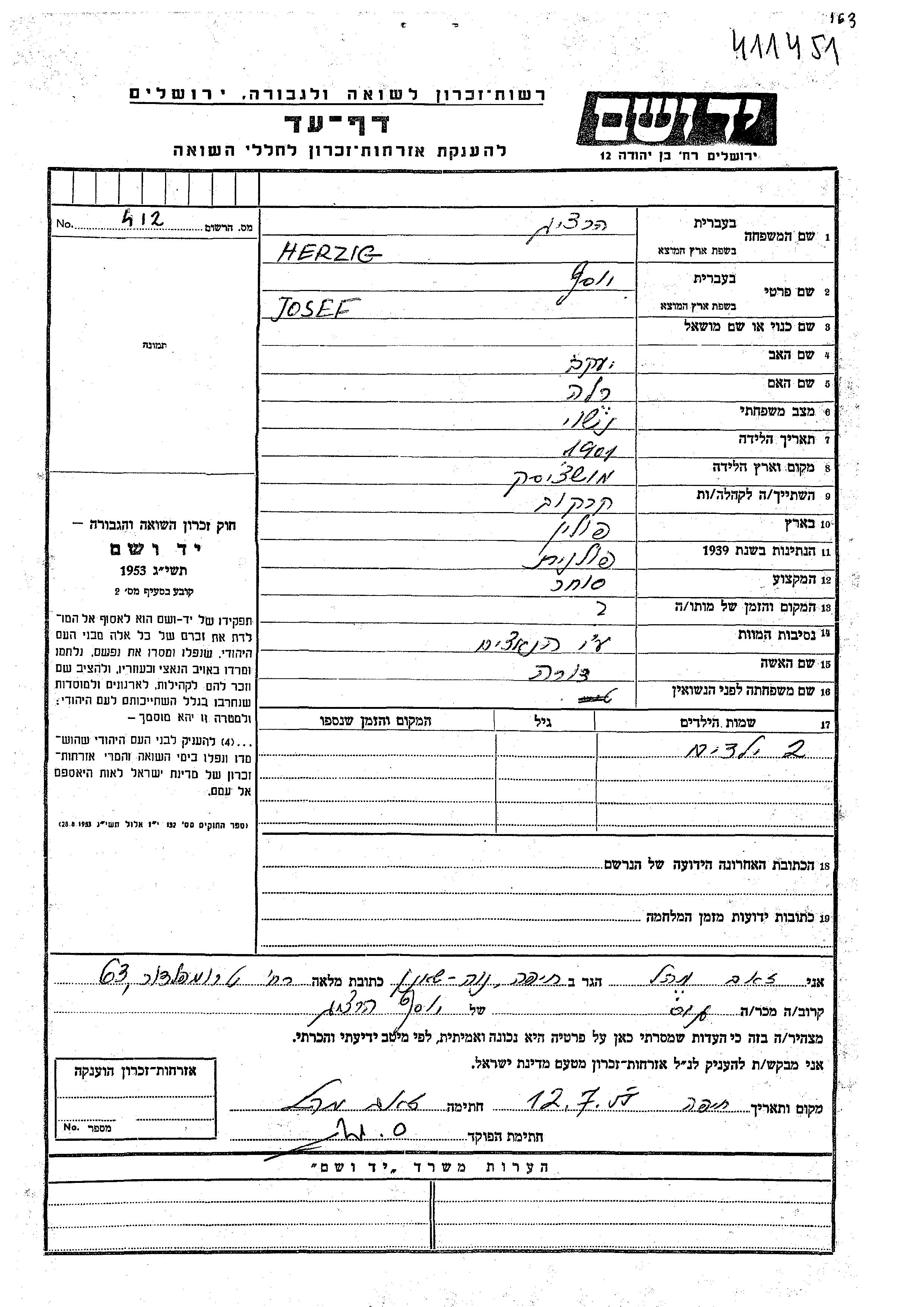 Josef Herzig Hertzog wurde im Jahr 1901 in Mosciska, Polen geboren. Er war der Sohn von Yaakov und Rela. Er war Kaufmann/-frau und mit Dora Verheiratet.