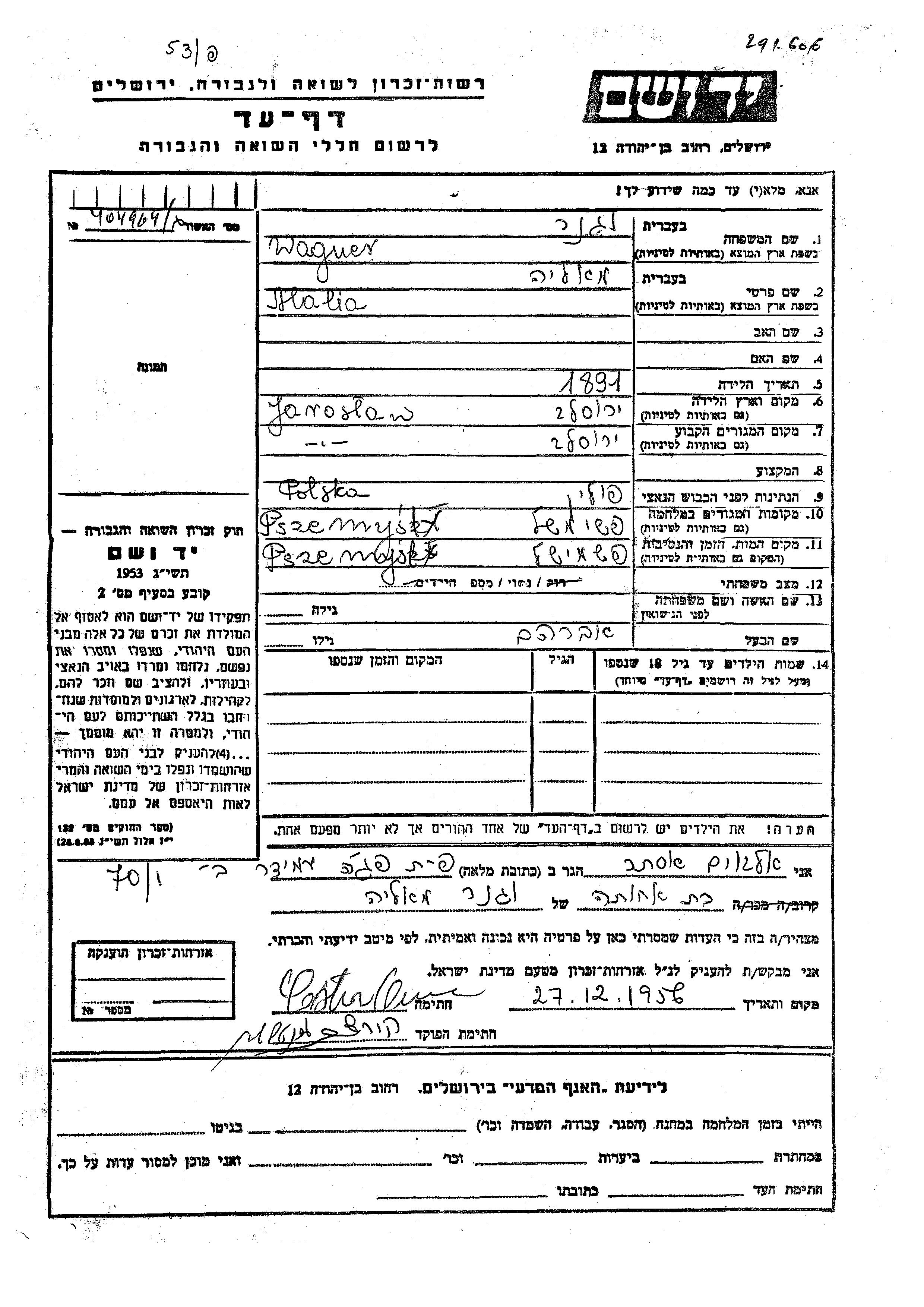 Malia Wagner wurde im Jahr 1891 in Yaroslav, Polen geboren. Sie war mit Avraham Verheiratet. Vor dem Zweiten Weltkrieg lebte sie in Yaroslav, Polen. Während des Krieges war sie in Przemysl, Polen.