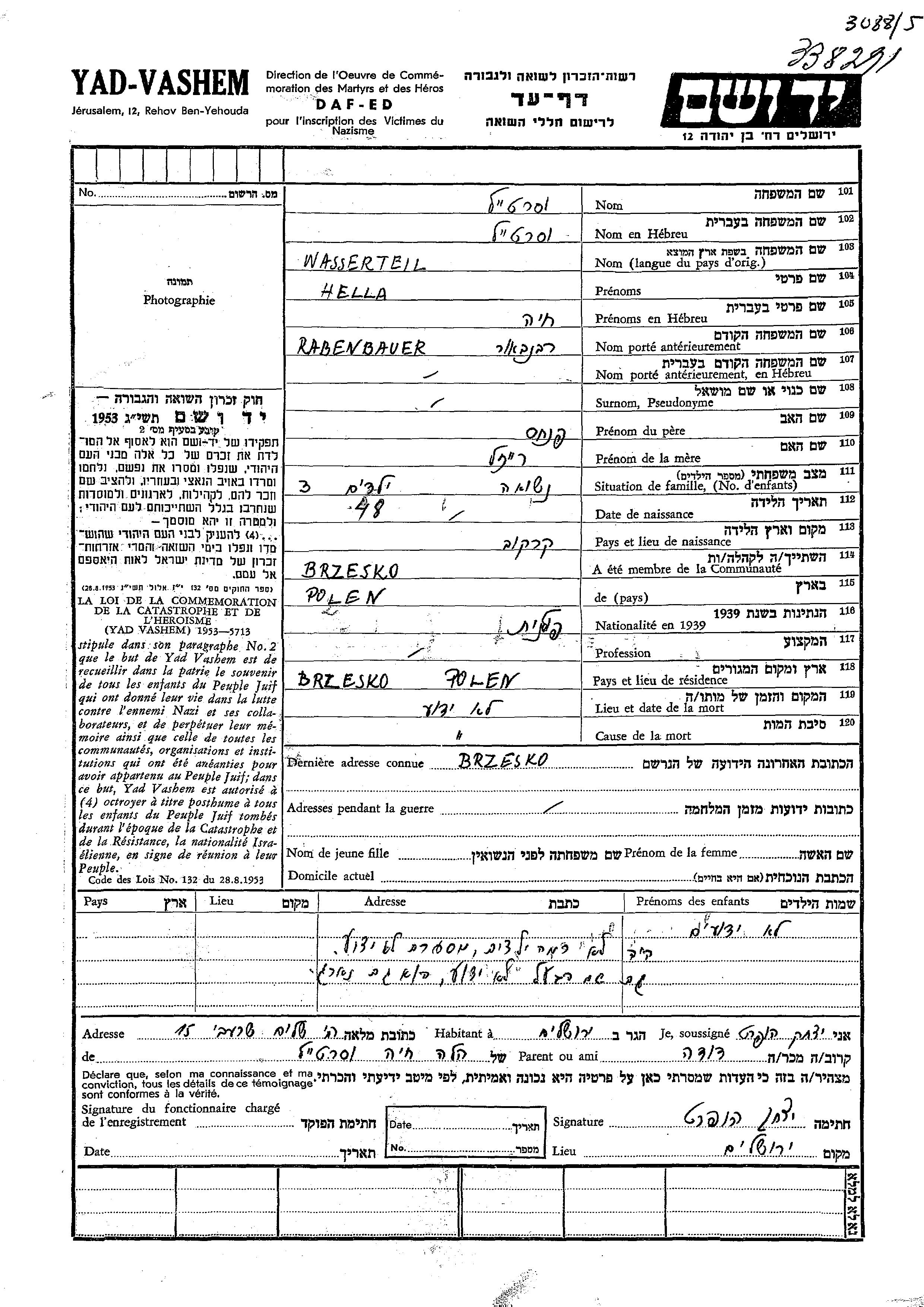 Hella Khaia Wasserteil, geb. Rabenbauer wurde in Krakow, Polen geboren. Sie war die Tochter von Pinkhas und Reizl. Sie war Verheiratet. Vor dem Zweiten Weltkrieg lebte sie in Krakow, Polen.