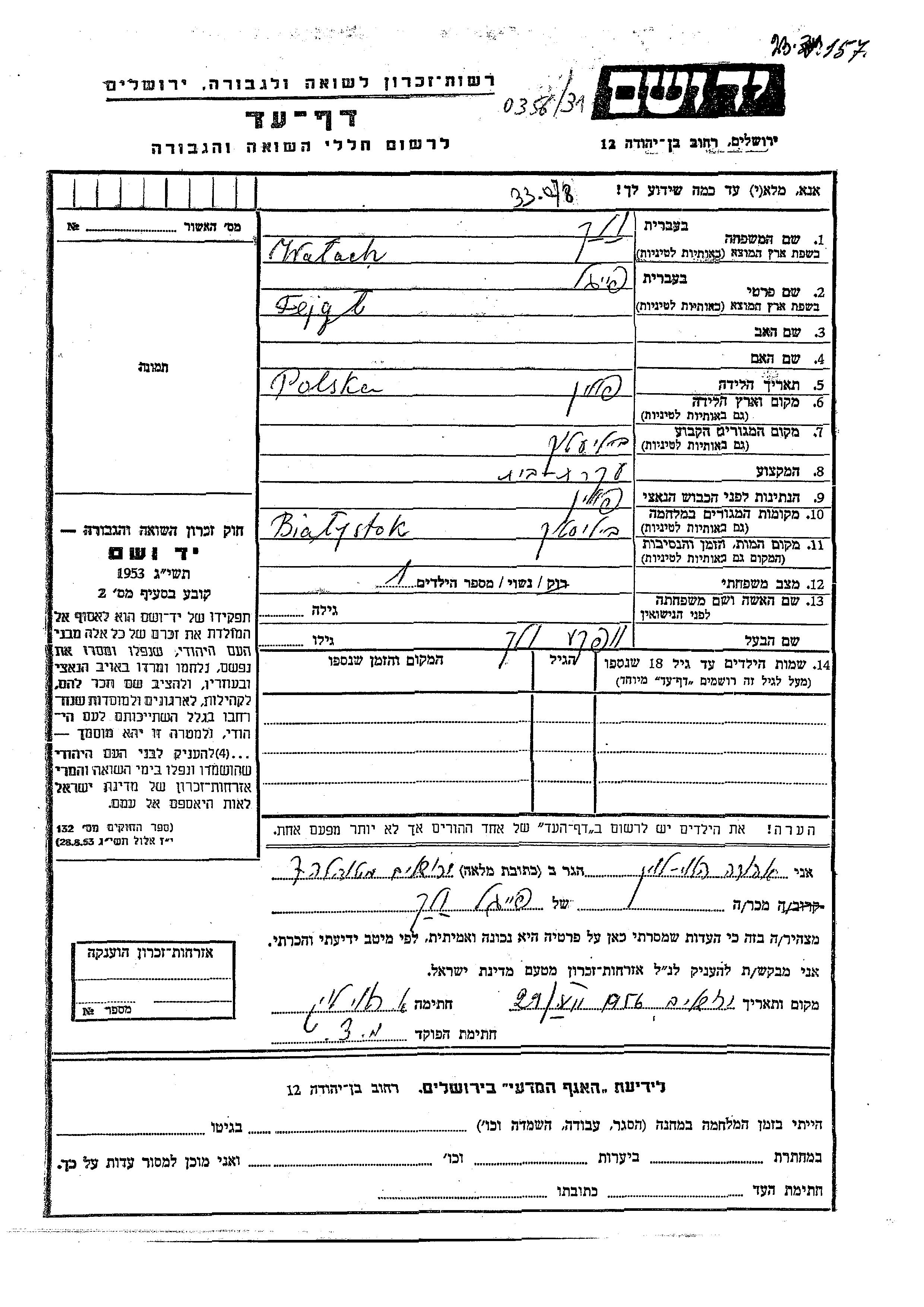Walach Fejgl Bialystok, Polen Gedenkblatt