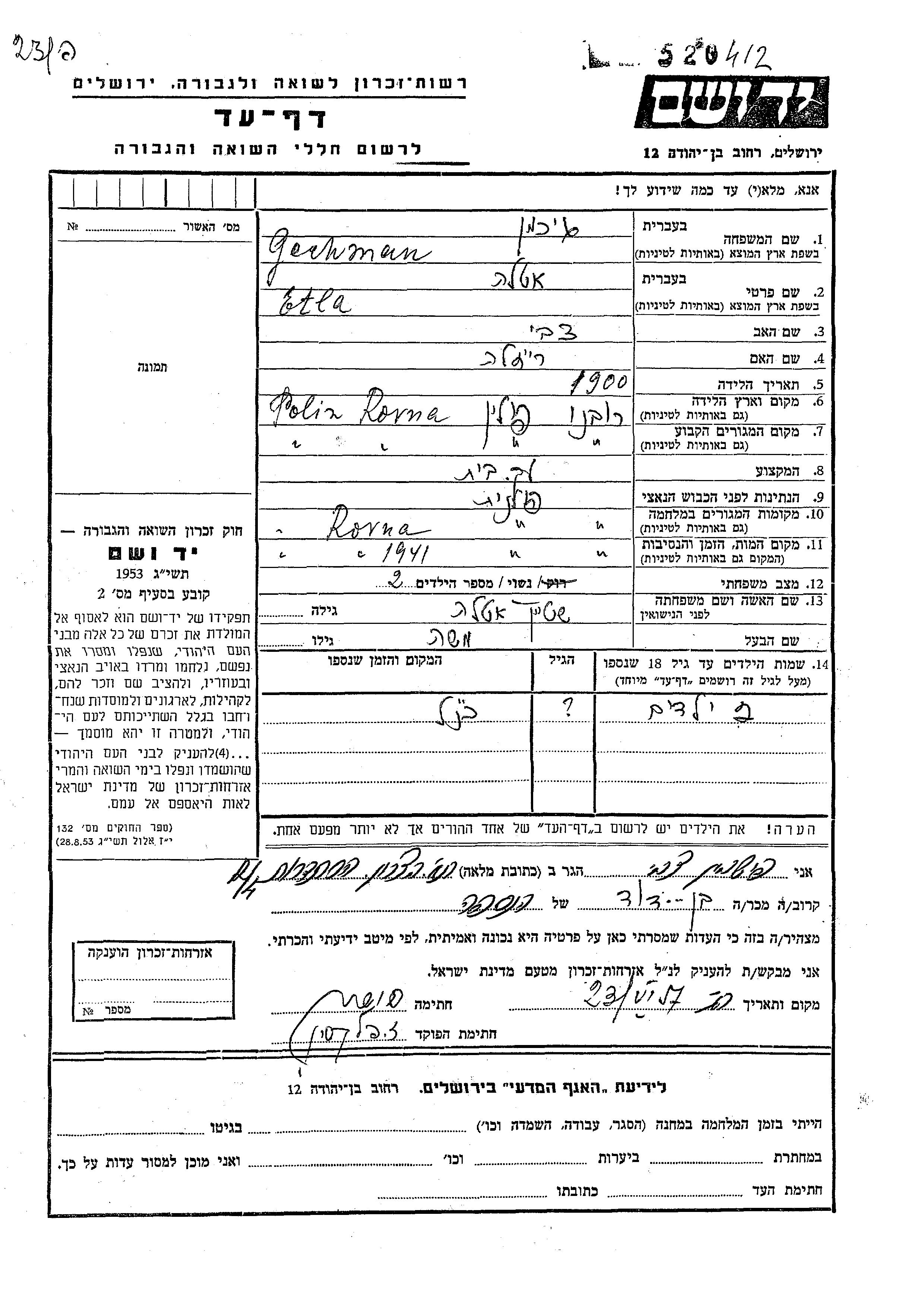 Etla Gechman Geikhman, geb. Shtein wurde im Jahr 1900 in Rovne, Polen geboren. Sie war die Tochter von Tzvi und Raizla. Sie war Hausfrau und mit Moshe Verheiratet. Vor dem Zweiten Weltkrieg lebte sie in Rovne, Polen. Während des Krieges war sie in Rovne, Polen.