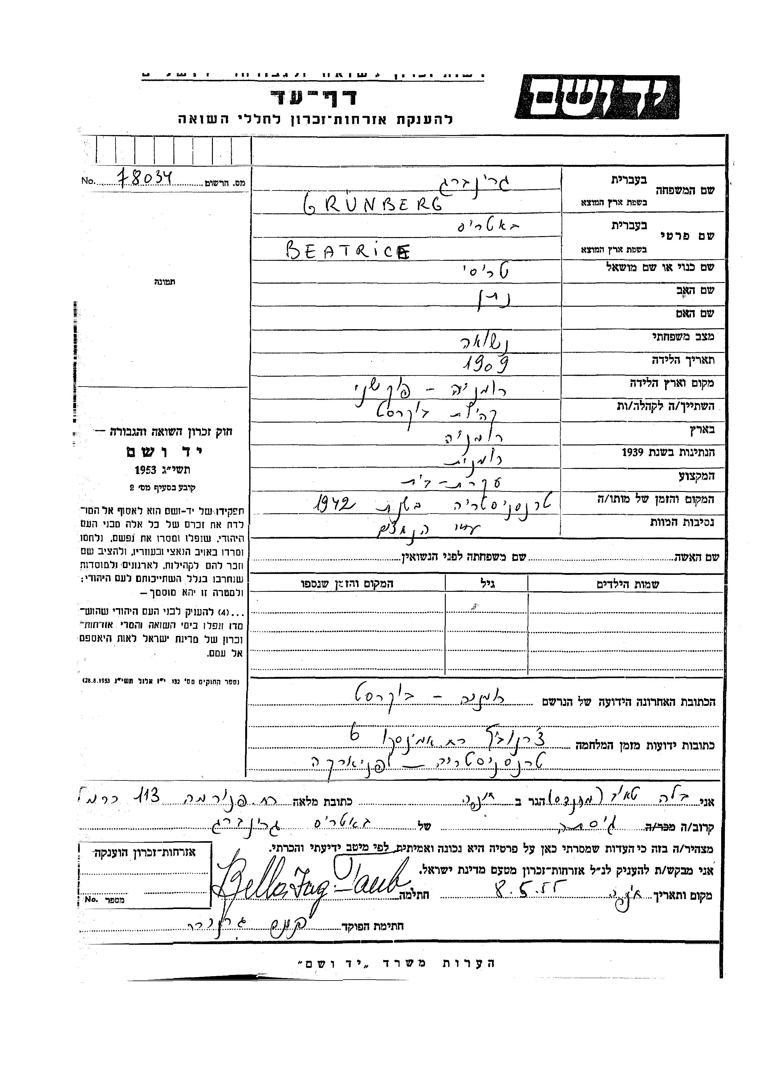 Beatrice Grunberg wurde im Jahr 1909 in Focsani, Rumänien geboren. Sie war die Tochter von Natan. Sie war Hausfrau und Verheiratet. Vor dem Zweiten Weltkrieg lebte sie in Bucuresti, Rumänien. Während des Krieges war sie in Czernowitz, Rumänien.