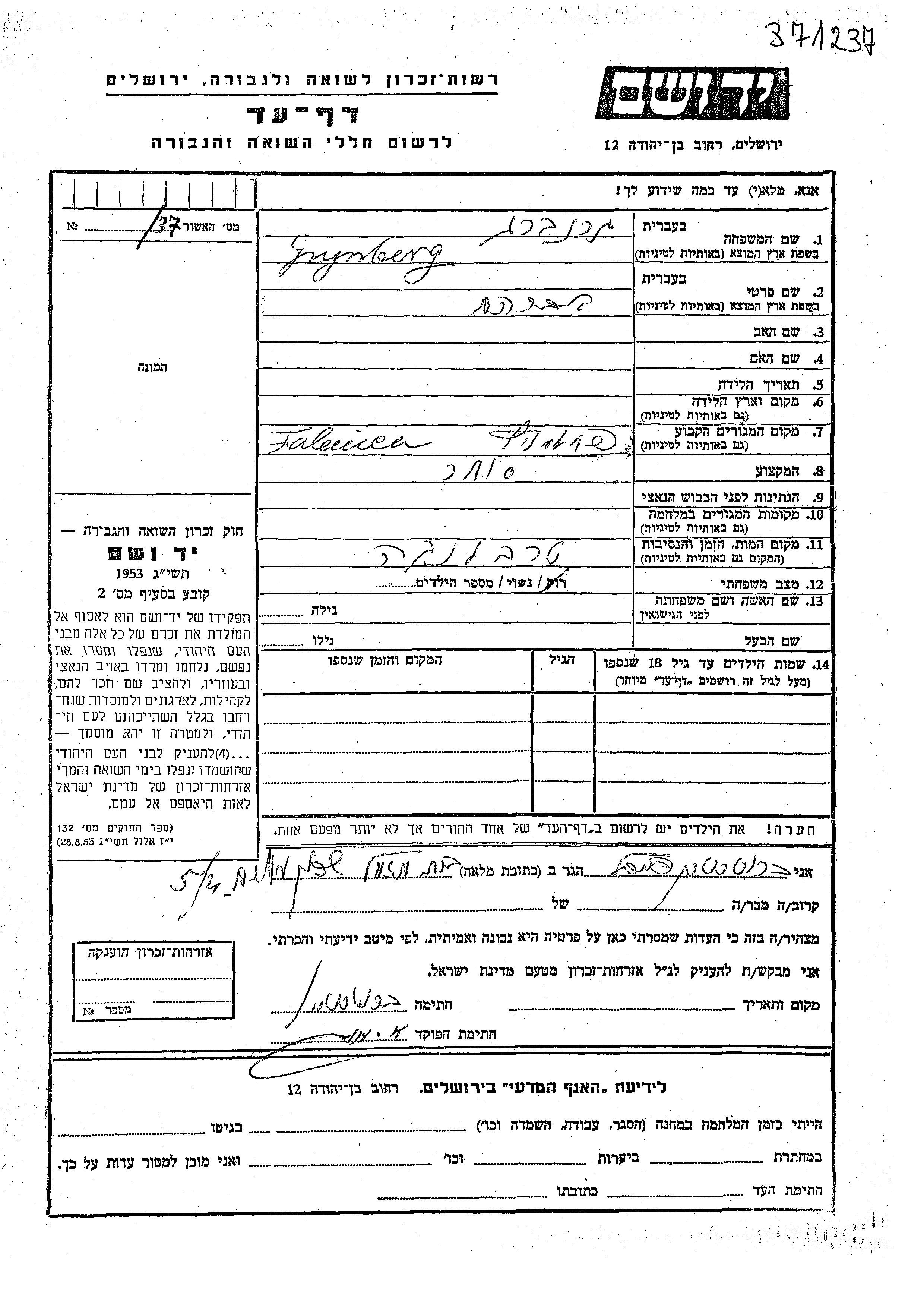 Avraham Grynberg Garenberg. Er war Kaufmann/-frau und Verheiratet. Vor dem Zweiten Weltkrieg lebte er in Falenica, Polen. Während des Krieges war er in Polen.