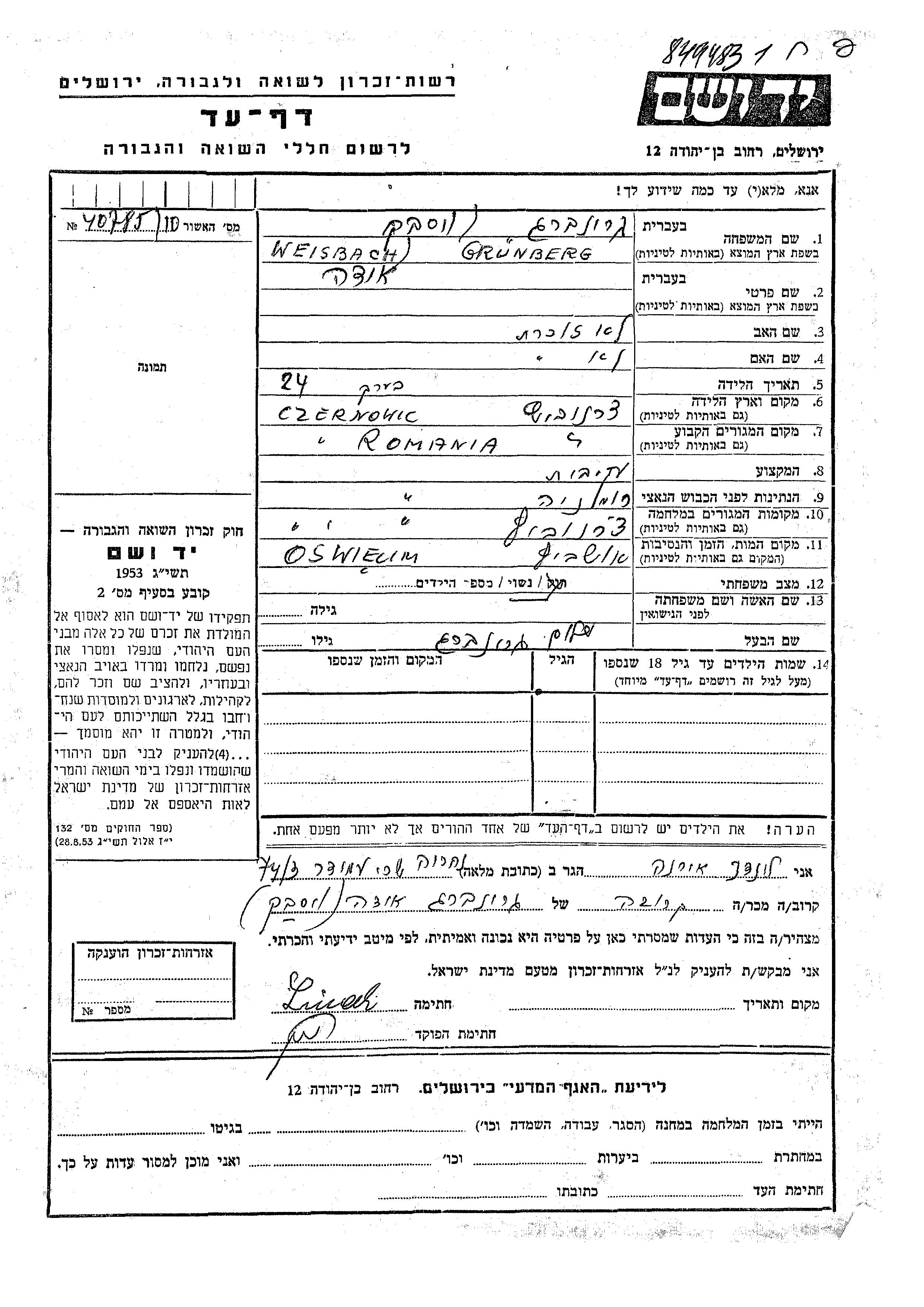 Ida Grunberg, geb. Weisbach wurde in Cernauti, Rumänien geboren. Sie war Hausfrau und mit Shalom Verheiratet. Vor dem Zweiten Weltkrieg lebte sie in Cernauti, Rumänien. Während des Krieges war sie in Cernauti, Rumänien.