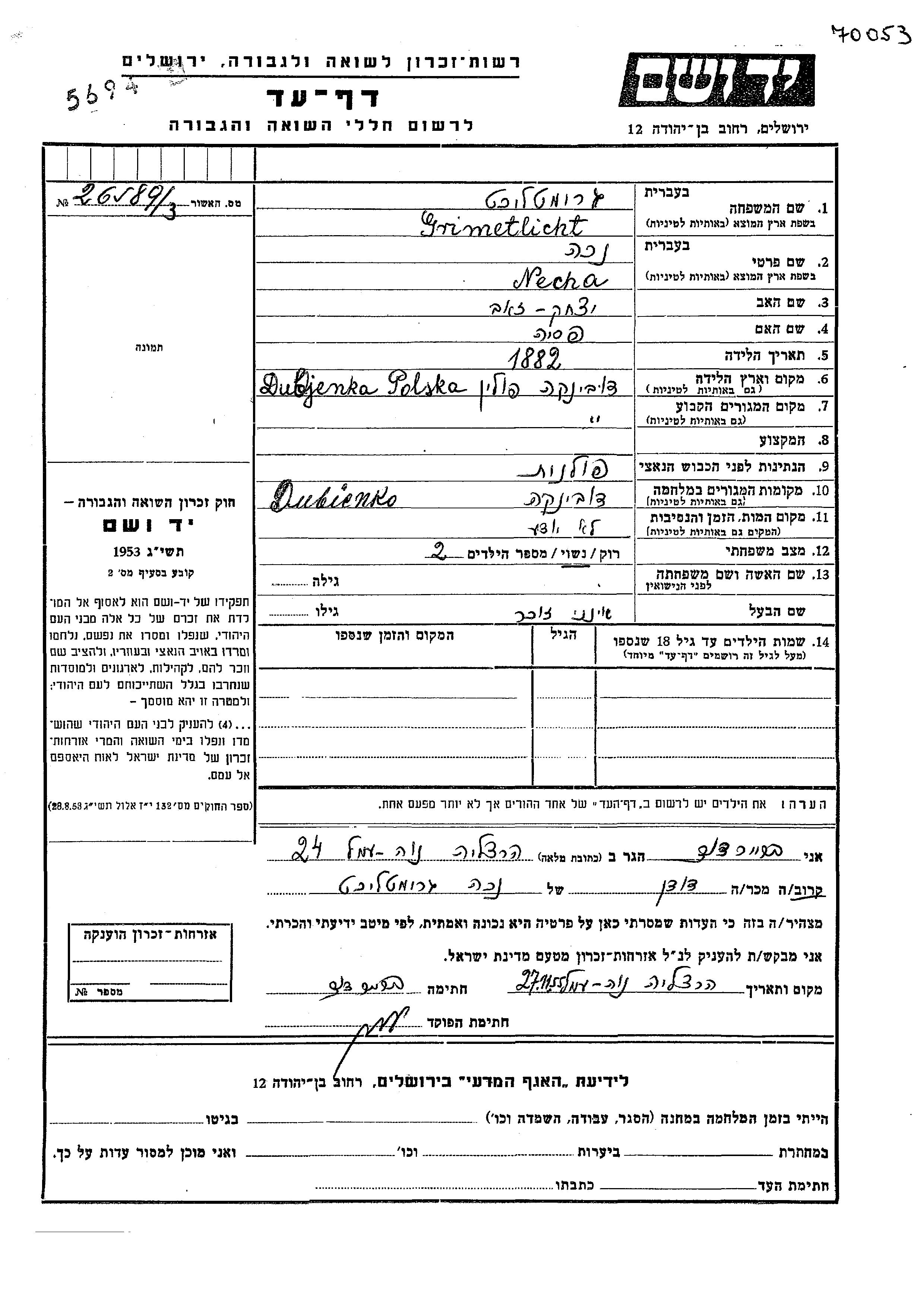 Necha Grimetlicht wurde im Jahr 1882 in Dubianka, Polen geboren. Sie war die Tochter von Yitzkhak Zeev und Pesia. Sie war Verheiratet. Vor dem Zweiten Weltkrieg lebte sie in Dubianka, Polen. Während des Krieges war sie in Dubianka, Polen.