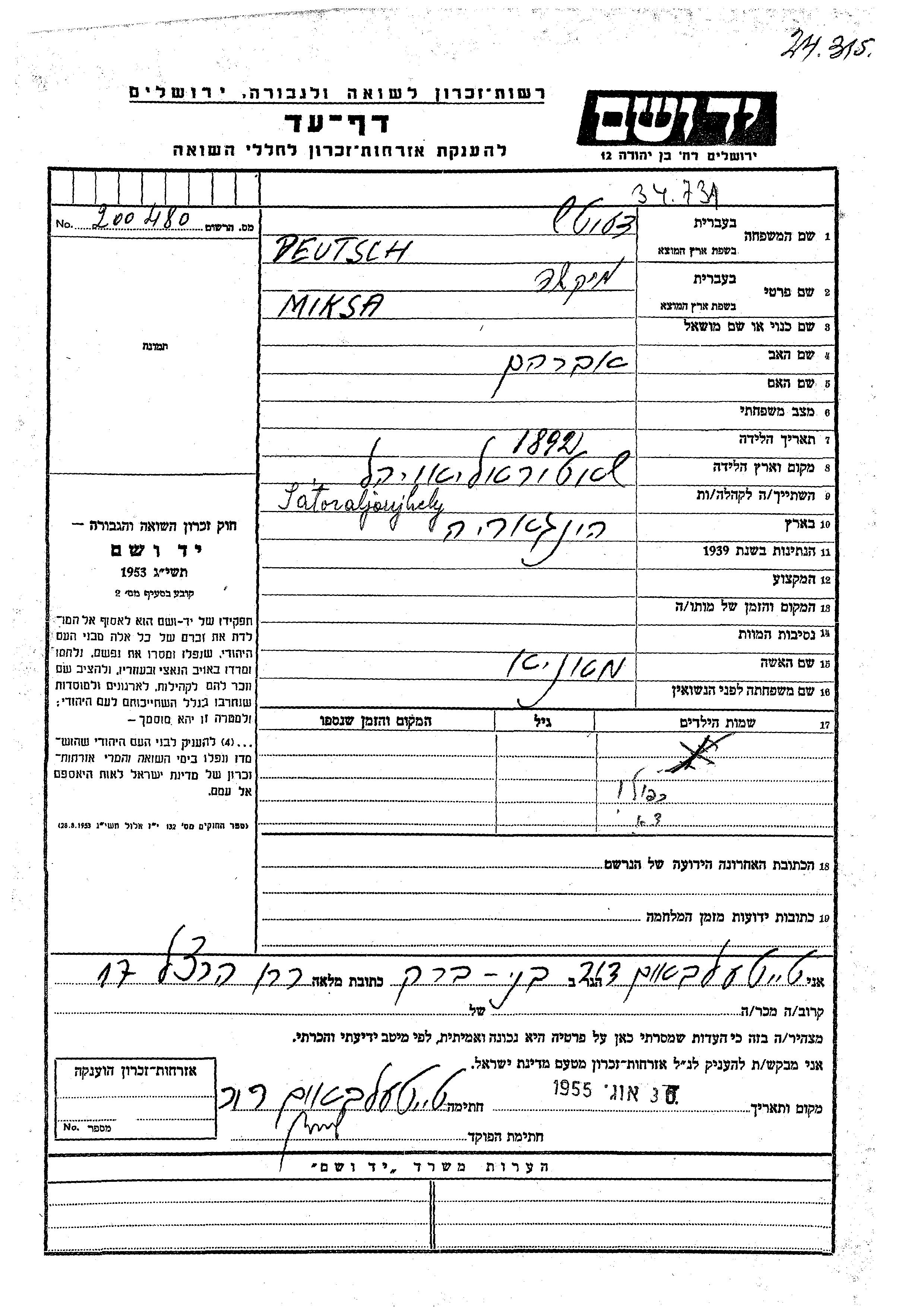 Miksa Deutsch wurde im Jahr 1892 in Satoraljaujhely, Ungarn geboren. Er war der Sohn von Avraham.