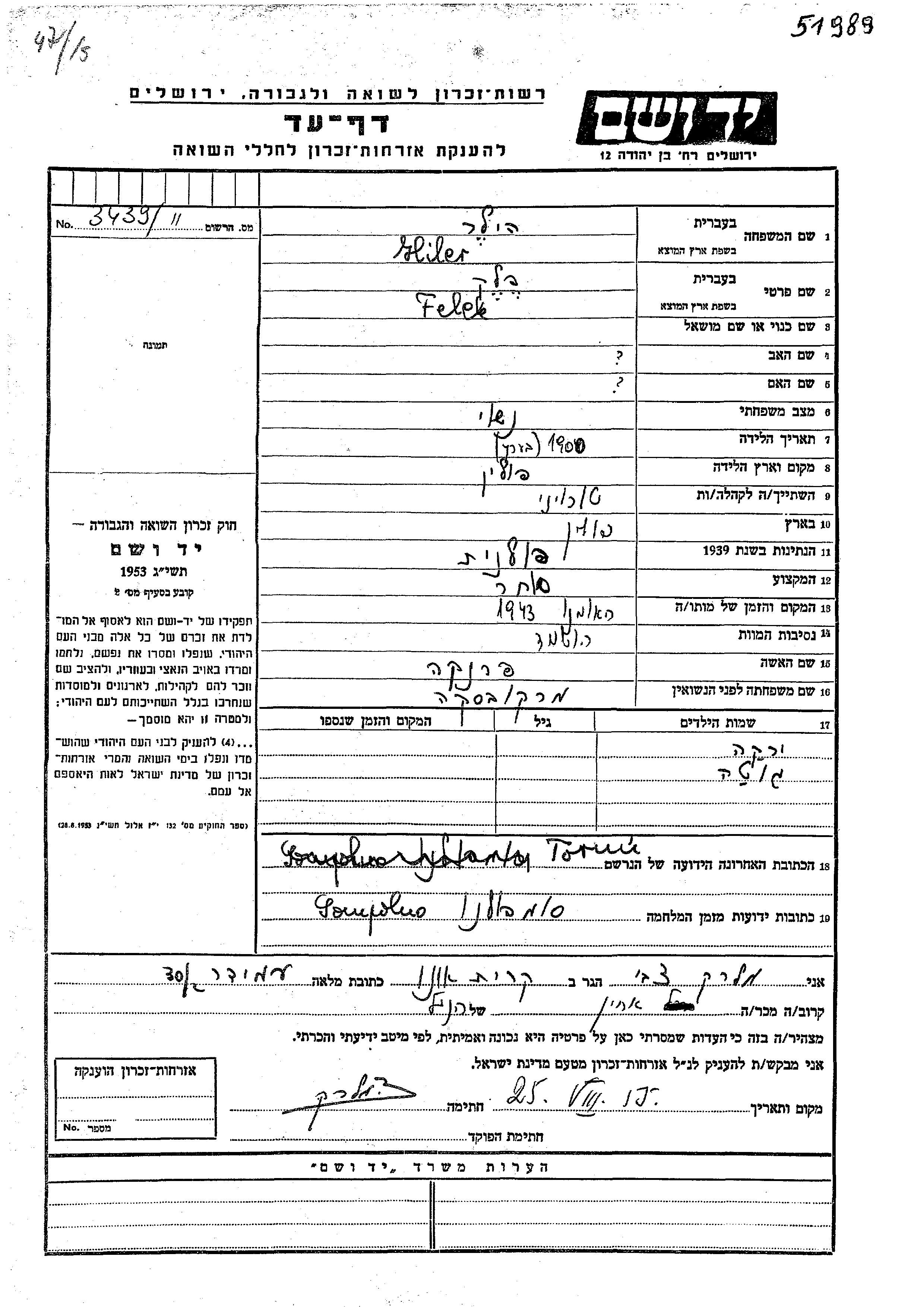 Felek Hiler wurde im Jahr 1900 in Polen geboren. Er war Kaufmann/-frau und mit Franka, geb. Markovska Verheiratet. Während des Krieges war er in Sompolna, Polen.