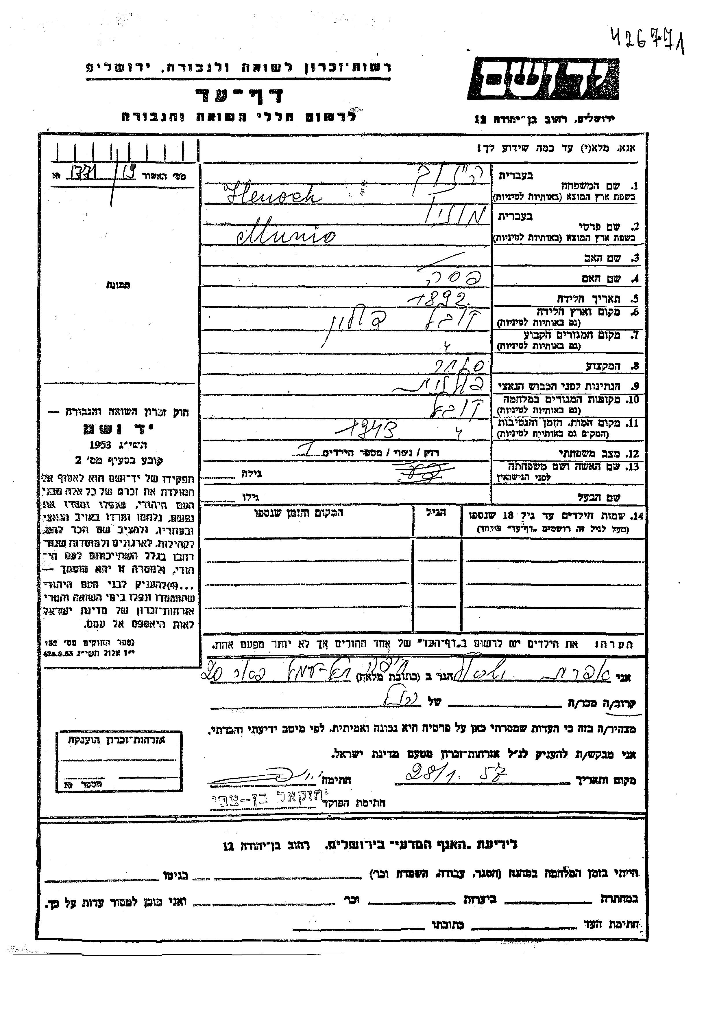 Henokh Munio 1892 Kowel, Polen Gedenkblatt