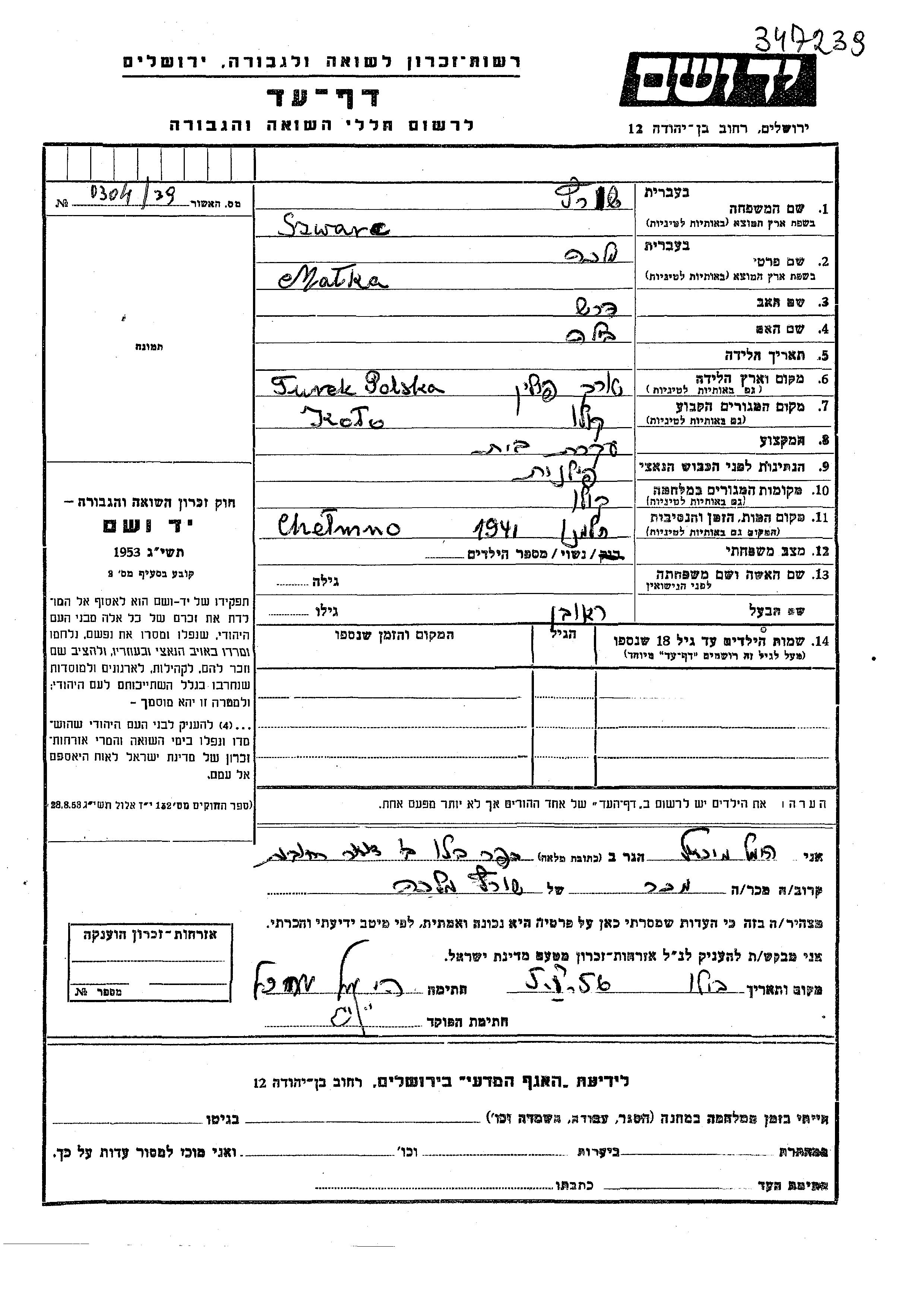 Malka Szwarc wurde in Turek, Polen geboren. Sie war die Tochter von Hersh und Bila. Sie war Hausfrau und mit Reuven Verheiratet. Vor dem Zweiten Weltkrieg lebte sie in Kolo, Polen. Während des Krieges war sie in Kolo, Polen.