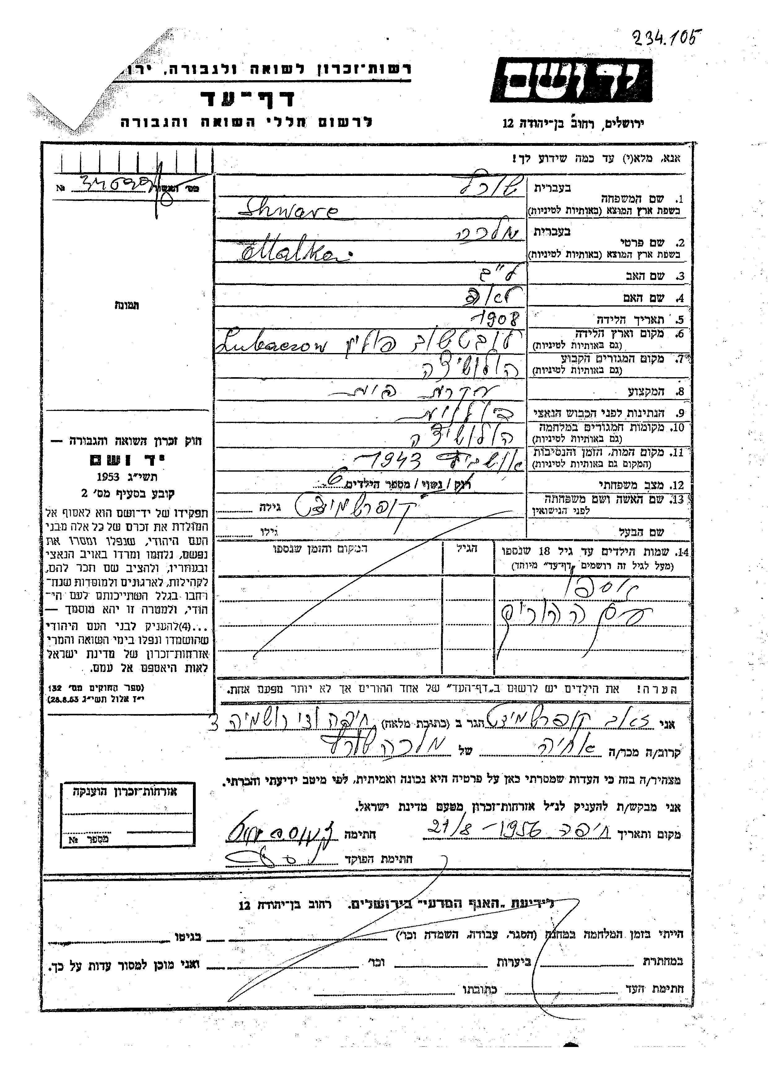 Malka Shwarc, geb. Kupershmid wurde im Jahr 1908 in Lubaczow, Polen geboren. Sie war die Tochter von Leib und Lea. Sie war Hausfrau und Verheiratet. Vor dem Zweiten Weltkrieg lebte sie in Holoszyce, Polen. Während des Krieges war sie in Holoszyce, Polen.